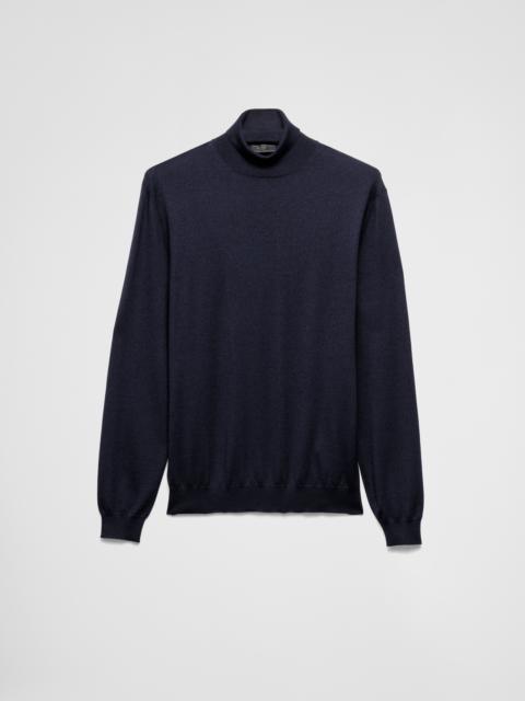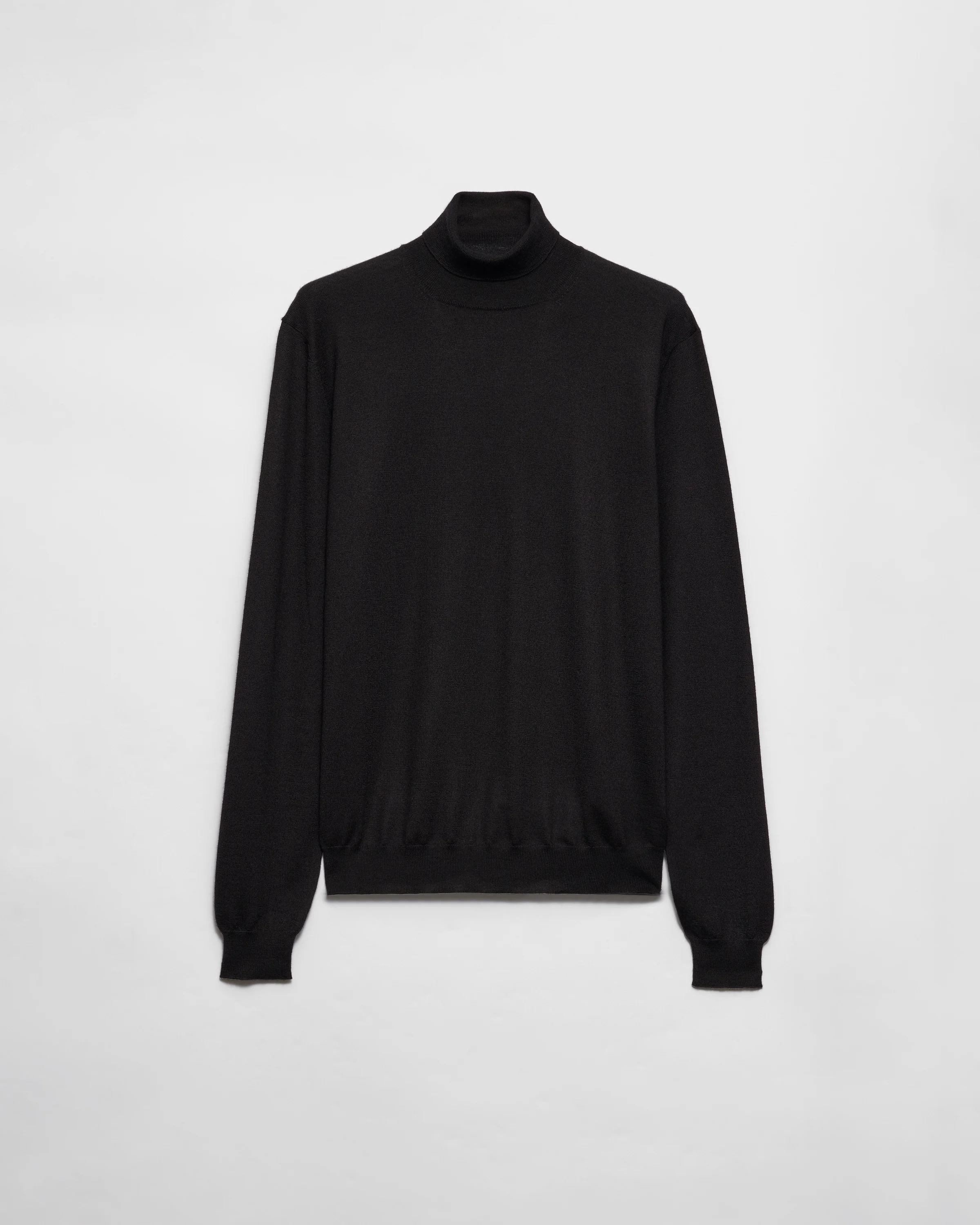 Made with a blend of fine cashmere and silk yarn, this turtleneck sweater embodies simple elegance and timeless style. - Product code: UMR651_0B8_F0002_S_OOO - Plain knit - Regular fit - Ribbed knit turtleneck - Raglan shoulder - Ribbed knit cuffs and hem - Knit triangle logo - Imported - The model is 189 cm tall and wears a size 48 Height: 66cm MATERIALS Main material: 30% silk 70% cashmere