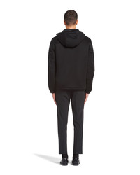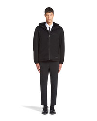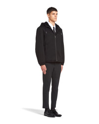 This men's blouson jacket comes in fine cashmere cloth made from very fine fibers bonded to a bio-based, waterproof and windproof technical membrane. For a second protective barrier, the cashmere undergoes a PCF Free waterproofing treatment that is free of toxic substances for the environment and primarily produced from renewable plant-based materials. Prada's duality is also expressed through the construction of its fabrics: traditional luxurious materials are combined with innovative, eco-sustainable, high-performance technical fibers. - Product code: SGB713_1YEQ_F0002_S_202 - Regular fit - Hooded collar - Straight sleeves - Zipper closure - Welt pockets - Elasticized cuffs - Regular shoulder - Elasticized hem - Hood drawstring with leather tip, elasticized drawstring on the hem - Lined and padded - Saffiano leather label - Imported Height: 70cm MATERIALS Cashmere