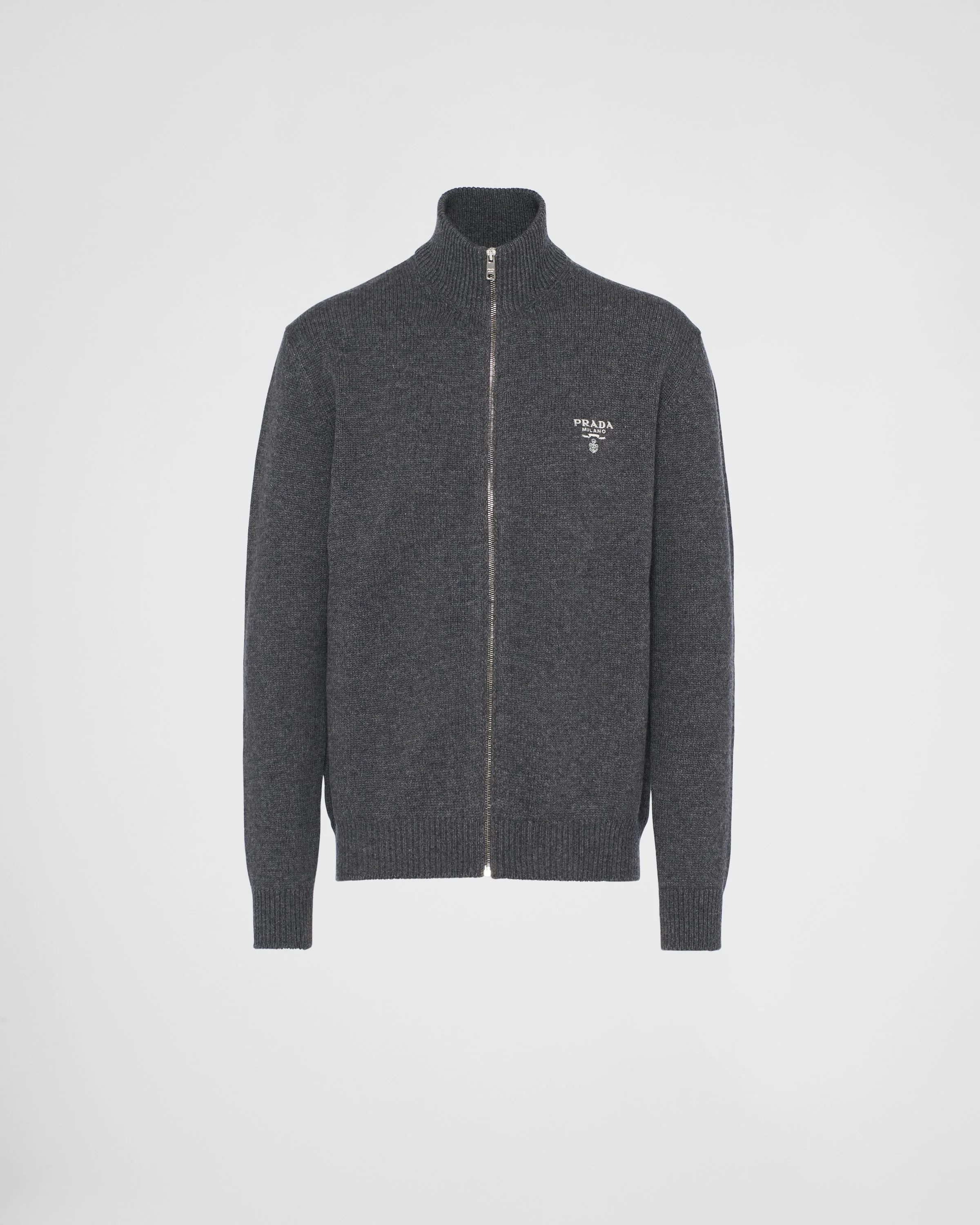 Sportswear lines meet refined materials and fine workmanship in this cashmere cardigan. This garment, which recalls Prada's hybrid soul, has a slim fit and features the embroidered logo. - Product code: UMG245_11LM_F0480_S_232 - Plain knit - Slim fit - Ribbed knit neck - Semi-raglan shoulder - Ribbed knit cuffs and hem - Embroidered logo - Front zipper closure - Imported - The model is 189 cm tall and wears a size 48 Height: 68cm MATERIALS Main material: 100% cashmere