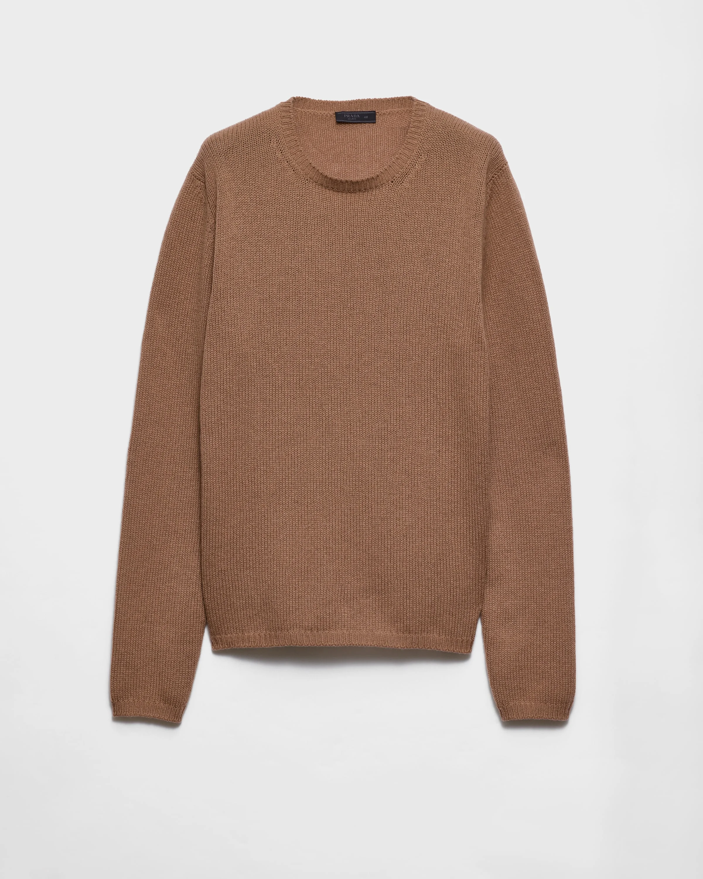 Vibrant rust color for this Prada soft and warm cashmere sweater. Classic crewneck and ribbed cuffs, collar and waistband in a catchy monochrome hue. An evergreen piece for an upgrade of your knitwear. - Product code: UMN864_643_F0040_S_122 - 100% cashmere gauge 5 - Imported Height: 64cm MATERIALS Main material: 100% cashmere