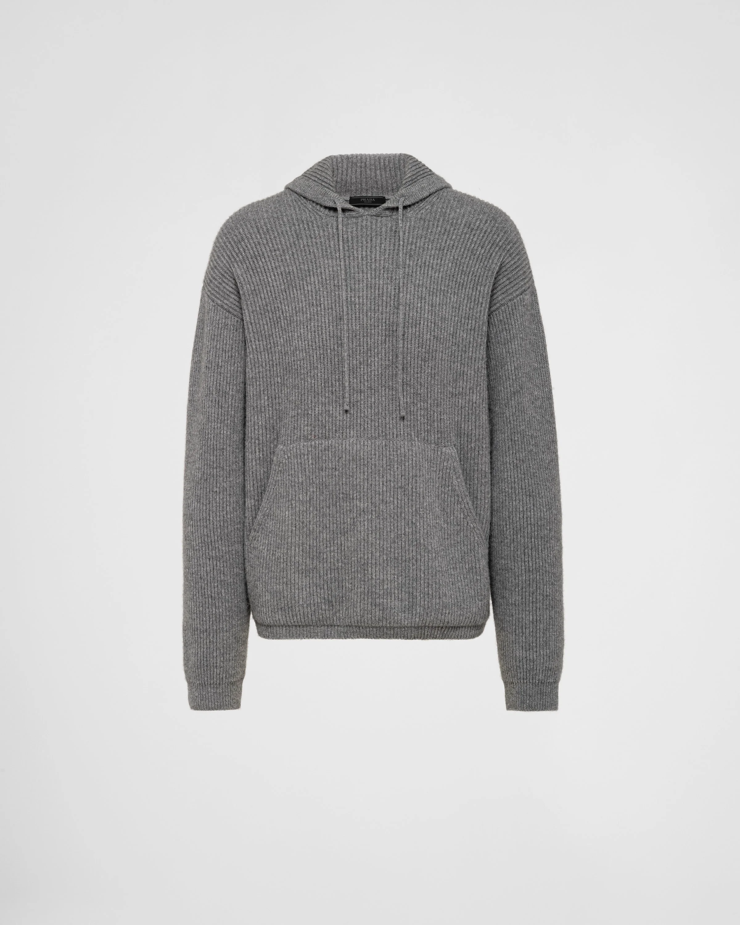 The sports-inspired design of this knit hoodie is enriched by the soft, sophisticated touch of ribbed knit cashmere. The garment with a relaxed fit and large pouch pocket is completed by the simple but iconic signature of the knit triangle logo on the back. - Product code: UMB766_14G5_F0031_S_OOO - Ribbed knit - Oversized fit - Neckline with hood - Regular shoulder - Ribbed knit cuffs and hem - Knit triangle logo - Pouch pocket - Imported - The model is 187 cm tall and wears a size 48 Height: 68cm MATERIALS Main material: 100% cashmere