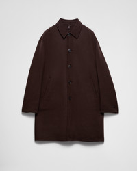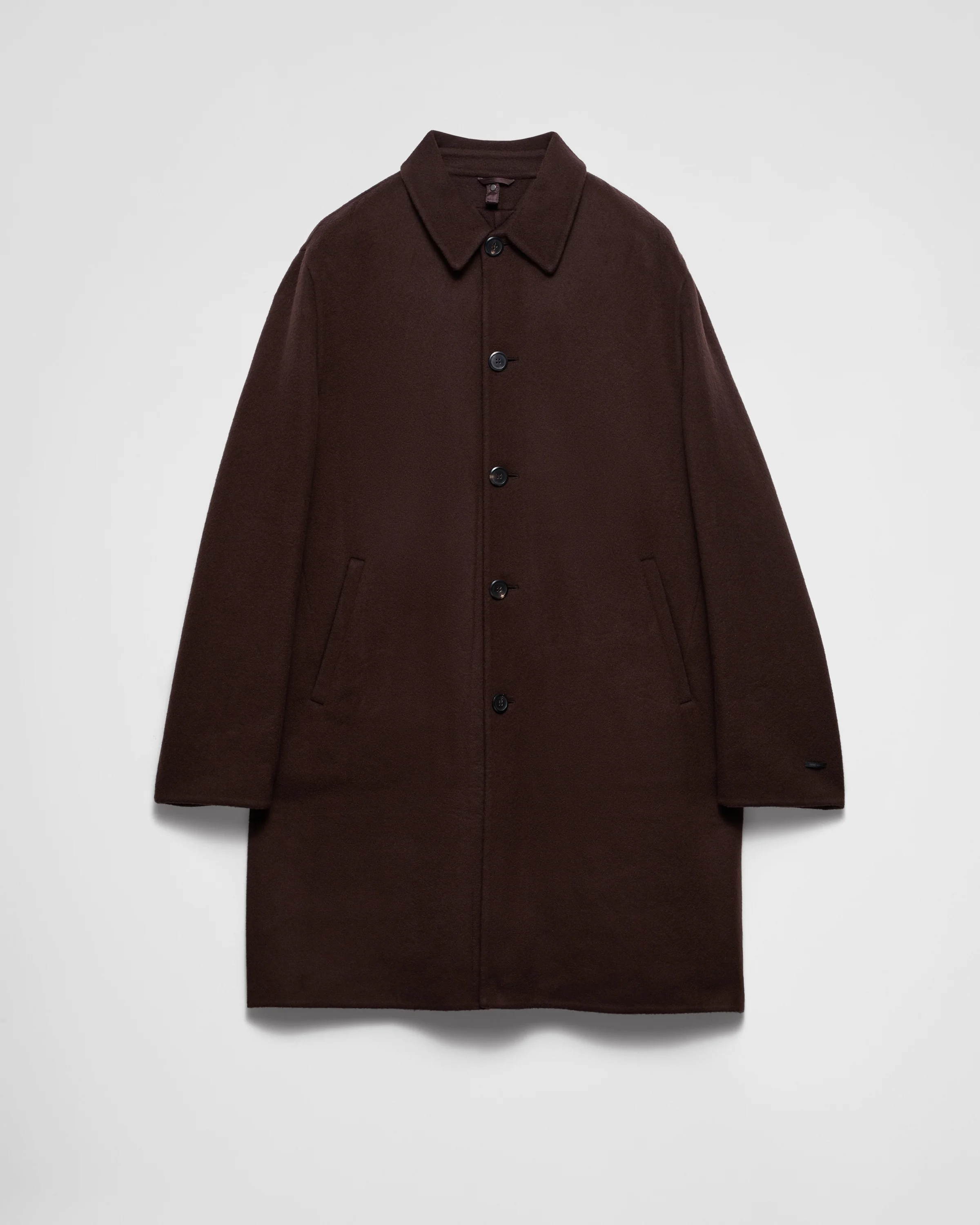 This double cashmere overcoat is characterized by its refined design, with a straight fit and a central slit. The classic shirt collar and button closure are complemented by welt pockets. The unlined construction with removable padding adds a versatile touch, while the matching stitching and triangle logo create a sophisticated visual effect. - Product code: UC524D_15UZ_F0192_S_OOO - Straight fit - Shirt collar - Central slit - 5-button closure - Buttonless cuffs - Welt pockets - Unlined with removable padding - Triangle fabric front - Matching stitching - Imported - The model is 190 cm tall and wears a size 48 Height: 105cm MATERIALS Main material: 100% cashmere