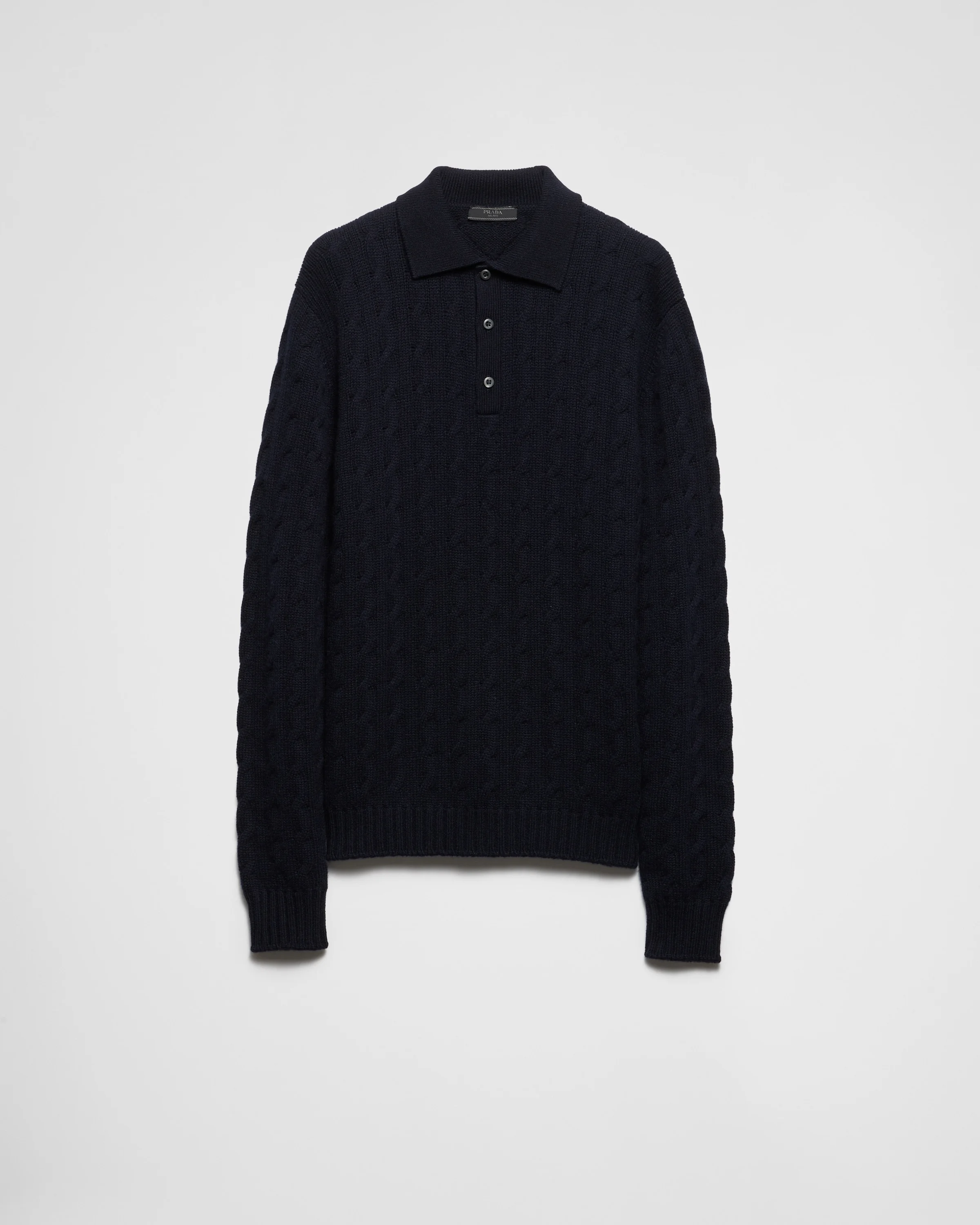 Refined, sleek details embellish the design of this polo shirt made of soft, luxurious cashmere with a cable-knit motif. The silhouette with informal elegance is completed by the iconic geometric shape of the triangle logo. - Product code: UMB809_145X_F0008_S_OOO - Cable-knit motif - Slim-fit silhouette - Polo shirt collar - Semi-raglan shoulder - Ribbed knit cuffs and hem - Knit triangle logo - Front closure with 3 buttons - Imported Height: 66cm MATERIALS Main material: 100% cashmere