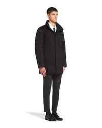 This long puffer jacket with a regular fit comes in fine cashmere cloth made from very fine fibers bonded to a bio-based, waterproof and windproof technical membrane. For a second protective barrier, the cashmere undergoes a PCF Free waterproofing treatment that is free of toxic substances for the environment and primarily produced from renewable plant-based materials. The garment is completed with a waterproof coated silk poplin lining. Prada's duality is also expressed through the construction of its fabrics: traditional luxurious materials are combined with innovative, eco-sustainable, high-performance technical fibers. - Product code: SGB715_1YEQ_F0002_S_202 - Regular fit - Stand-up collar and hidden hood - Straight sleeves - Zipper closure and snaps - Welt pockets - Straight cuff - Regular shoulder - Straight hem - Elasticized drawstring - Lined and padded with goose down - Sartorial label - Imported Height: 85cm MATERIALS Cashmere