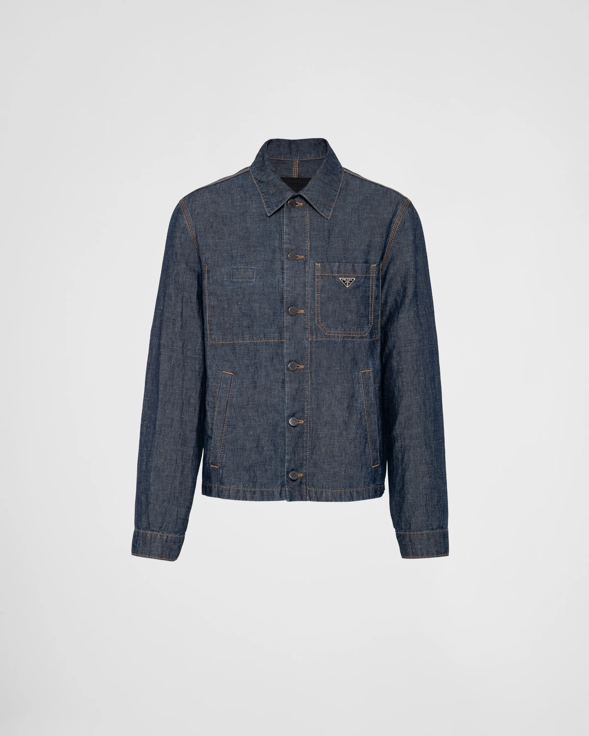 This blouson jacket made of chambray enhanced with a rinsed treatment features a timeless silhouette and casual attitude. The lightweight garment, defined by classic contrasting top-stitching, is enriched by the iconic triangle logo applied on the breast pocket. - Product code: GEB254_14J2_F0008_S_OOO - Rinsed treatment - Unlined - Classic fit - Shirt-style collar - Long sleeves, buttoned cuffs - Front button closure - Patch pockets on the chest - Low welt pockets - Center-back length: 64 cm, Size: M - Straight hem - Enameled metal triangle logo - Pressed garment - Imported - The model is 189 cm tall and wears a size 48 Height: 64cm MATERIALS Main material: 65% cotton 35% linen