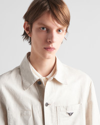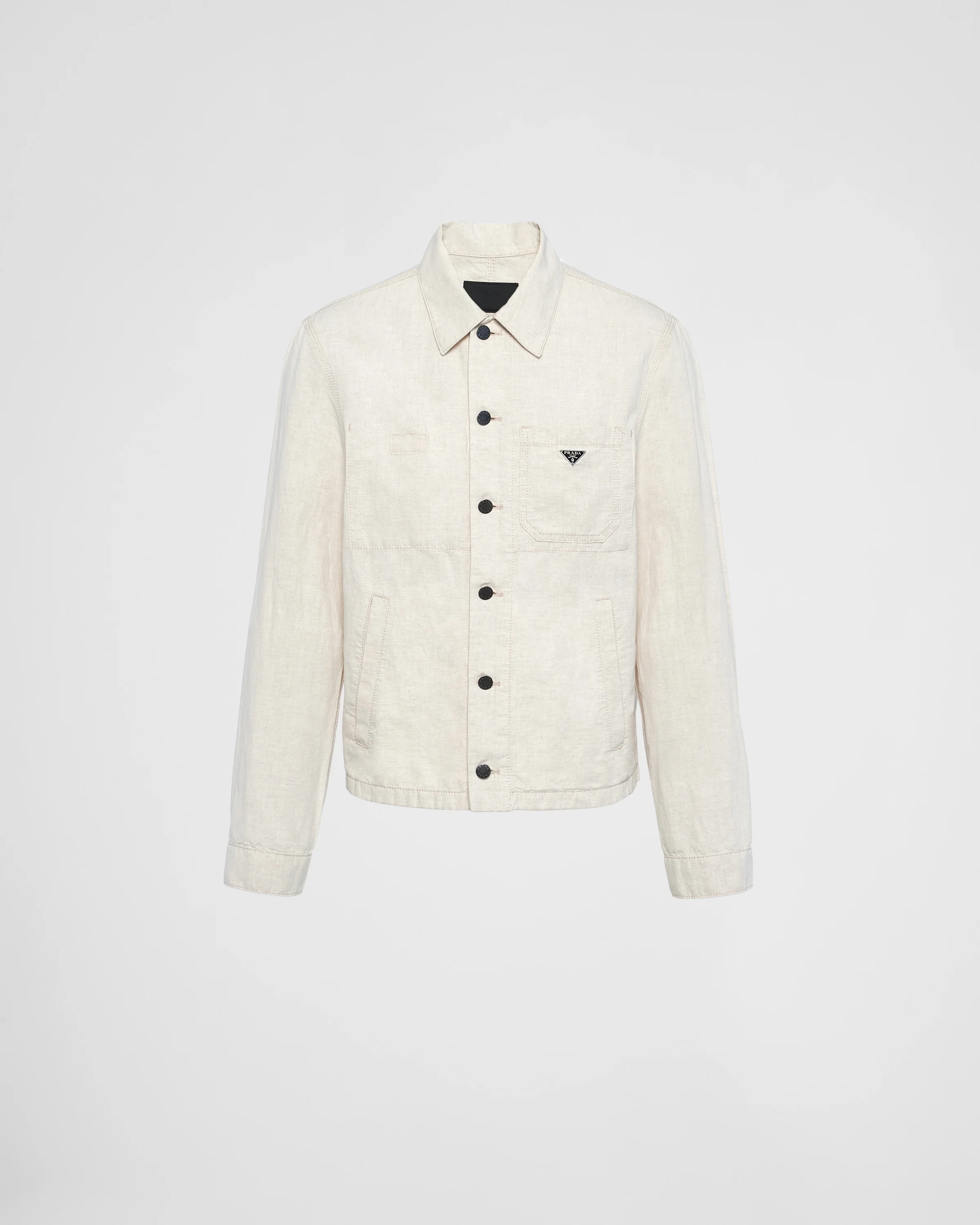 This blouson jacket made of chambray enhanced with a rinsed treatment features a timeless silhouette and casual attitude. The lightweight garment, defined by classic contrasting top-stitching, is enriched by the iconic triangle logo applied on the breast pocket. - Product code: GEB254_14J2_F0ABR_S_OOO - Rinsed treatment - Unlined - Classic fit - Shirt-style collar - Long sleeves, buttoned cuffs - Front button closure - Patch pockets on the chest - Low welt pockets - Center-back length: 64 cm, Size: M - Straight hem - Enameled metal triangle logo - Pressed garment - Imported - The model is 189 cm tall and wears a size 48 Height: 64cm MATERIALS Main material: 65% cotton 35% linen