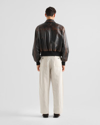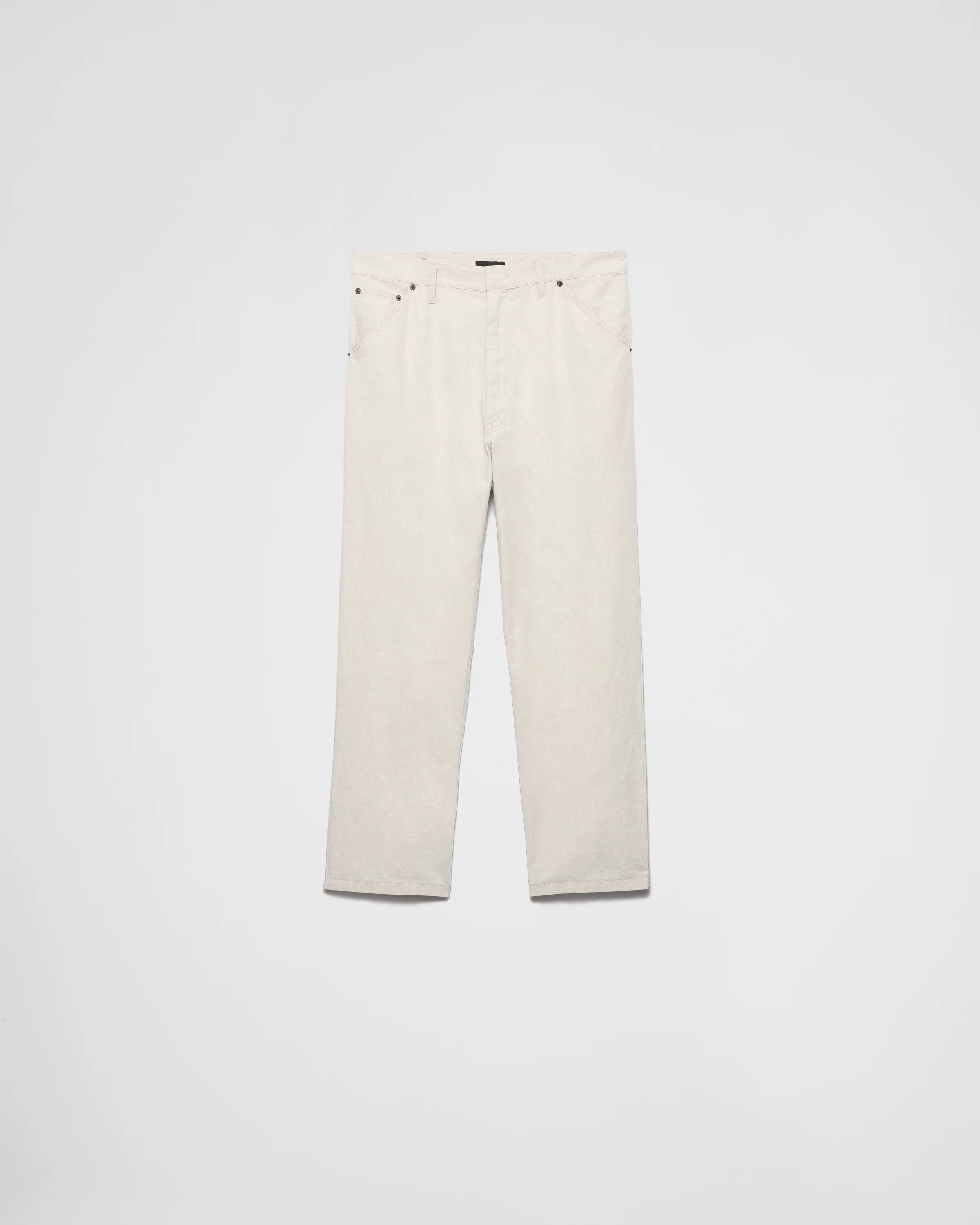These pants with casual allure are made of chambray fabric with a light, contemporary silhouette. The classic five-pocket style, emphasized by the rinse treatment, is completed by the iconic enameled metal triangle logo. - Product code: GEP403_14J2_F0ABR_S_OOO - Rinse treatment - Loose fit - Regular waist - Hem width: 22 cm, Size: M - Zipper fly with hook - Total length 100 cm, Size: M - Triangle logo - Imported - The model is 186 cm tall and wears a size 48 Height: 100cm MATERIALS Main material: 65% cotton 35% linen