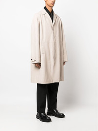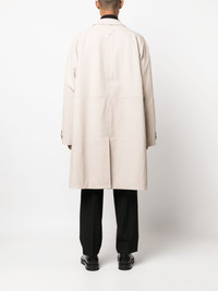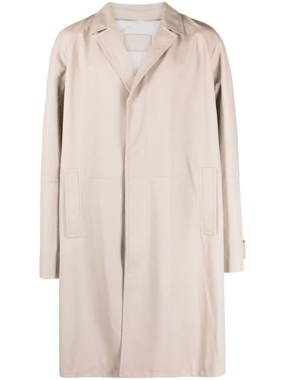 leather trench coat An elevated take on the classic trench, this coat from Prada is cut from supple beige leather. A tonal triangle-shaped patch adorns the nape – a refined nod to the house’s celebrated geometric logo motif. Highlights - Light beige - Lambskin - Notched lapels - Concealed front zip fastening - Long raglan sleeves - Belted cuffs - Two side slit pockets - Knee-length - Central rear vent Composition Lining: Viscose 100% Outer: Lamb Skin 100% SIZE & FIT Model measurements Height 6 ft 2 in(1.87 m) Bust/Chest 38.18 in(97 cm) Hips 36.61 in(93 cm) Waist 29.13 in(74 cm) FittingInformation Designed to be unstructured, offering a loose fit throughout Soft leather has a supple and smooth construction offering some flexibility This piece fits true to size – take your usual size