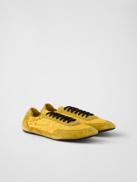 This incredibly lightweight sneaker with a structured design made of Re-Nylon and suede leather features a mix of materials that embodies Prada's sporty and artisanal soul. Its flat sole is enriched with elastic on the sides, making it easy to slip on. This product does not contribute to the SEA BEYOND educational program. - Product code: 2EG479_D7C_F0016_F_G001 - With laces - Screen-printed logo on the upper - Thin rubber sole - Removable leather-covered insole - These shoes have undergone an artisan treatment, giving the leather a deliberate vintage look. - Imported MATERIALS Main material: Recycled polyamide recycled polyester