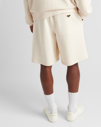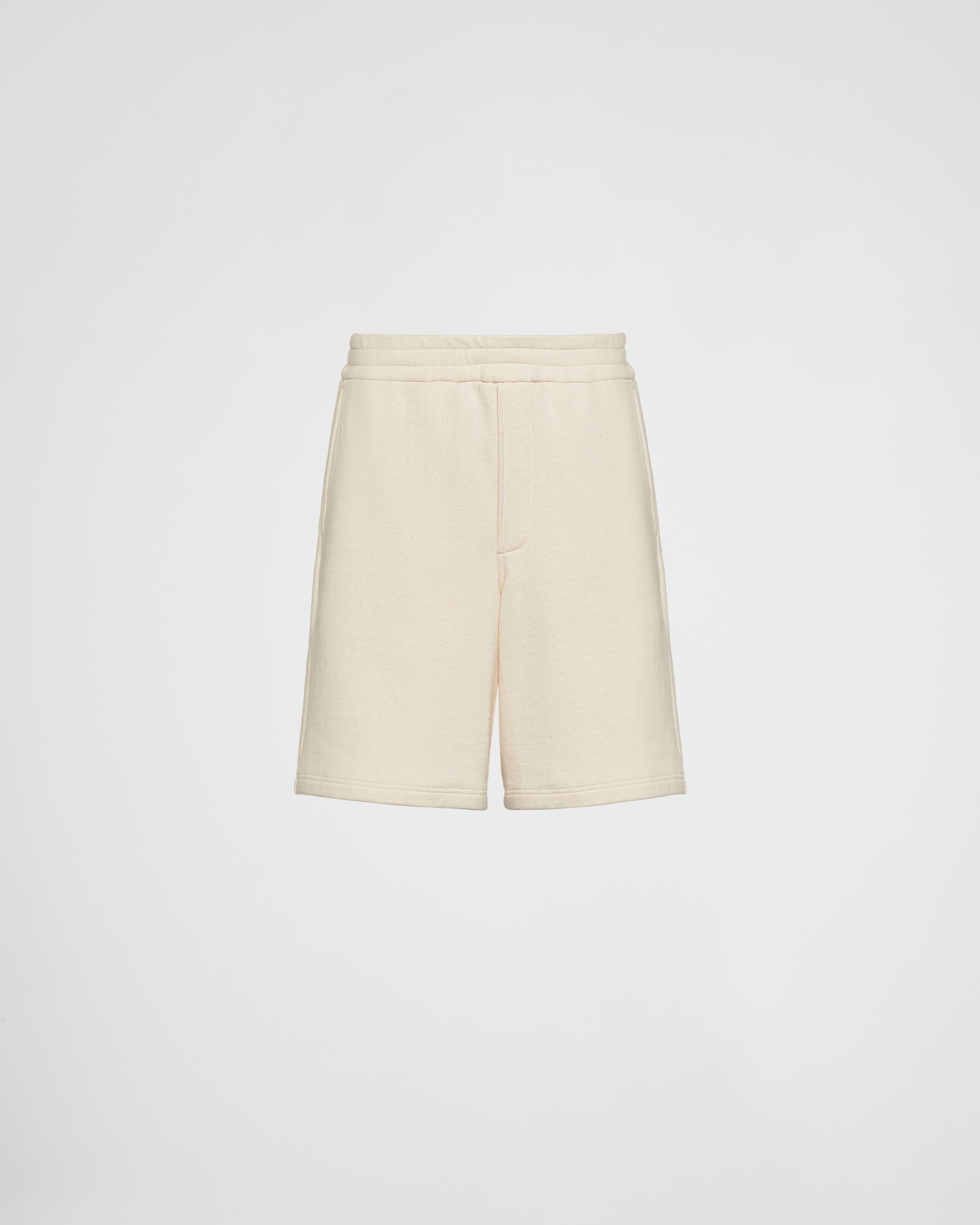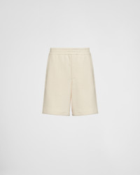 These cotton Bermudas with a sporty attitude and contemporary cut have a soft, relaxed silhouette. The style with drawstring waist and back zipper pocket is embellished with the sleek and iconic signature touch of the enameled metal triangle logo. - Product code: UJP224_14LJ_F0018_S_UMO - Waistband with internal drawstring - Straight hem - Enameled metal triangle logo - Length: 55 cm, Size: M - Small back zipper pocket - Imported - The model is 189 cm tall and wears a size 48 Height: 55cm MATERIALS Cotton