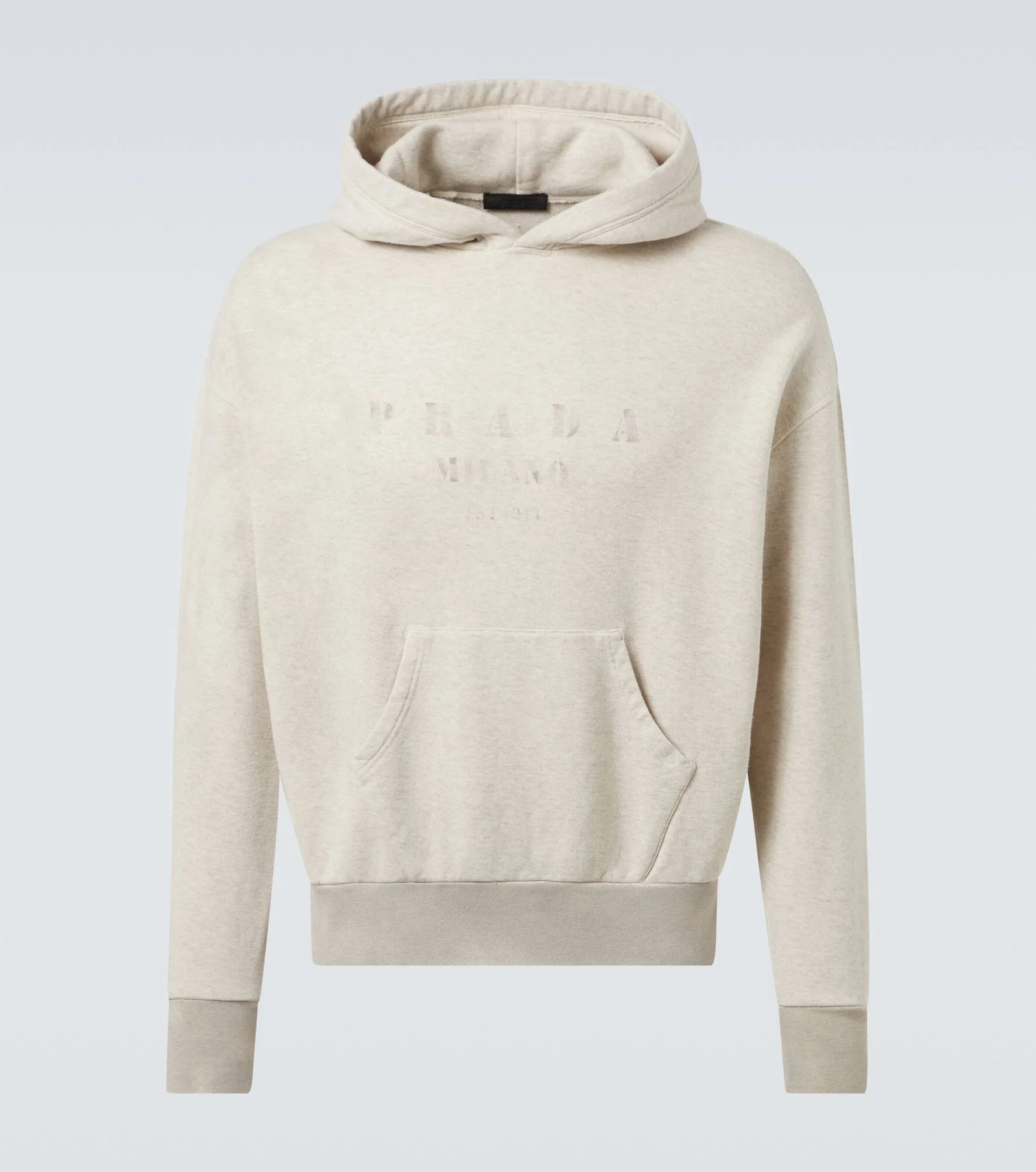 This hoodie is Prada's take on a classic collegiate style. Made from exceptionally soft cotton, the sweatshirt features a kangaroo pocket and the brand's logo printed at the heart. Product Details - Material: 100% cotton - Care instructions: dry clean - Made in Italy - Designer color name: Naturale - Item color: ivory - Item number: P01060642 Size & Fit - True to size - Dropped shoulders - Designed for a loose fit - Slightly stretchy fabric - Falls to the hip - The model in the picture is 185cm-6'1" and wearing a size L