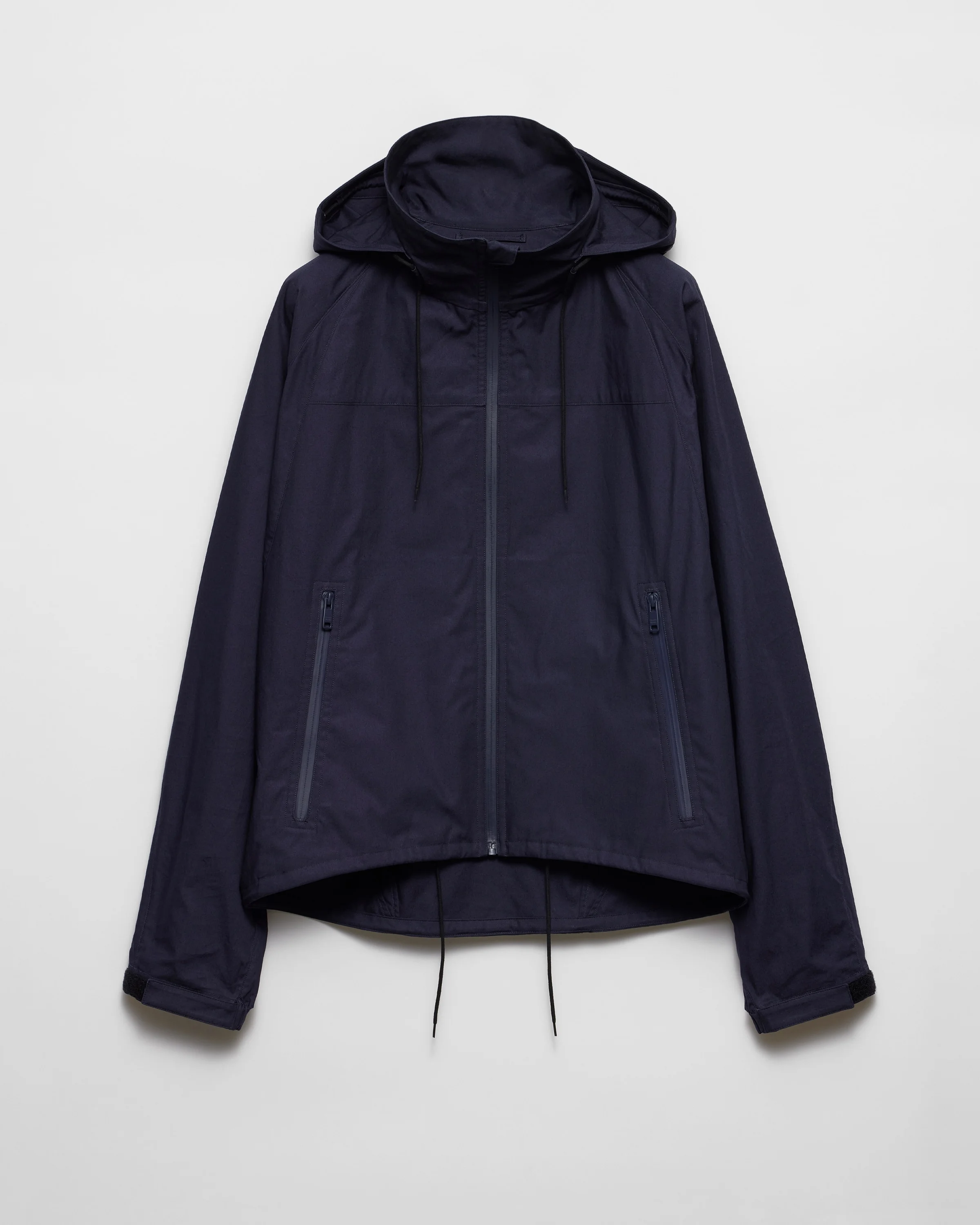 This cotton jacket recalls techwear thanks to its sporty design and functional details. The iconic fabric triangle logo completes the light, simple silhouette. - Product code: SGC875_17NV_F0008_S_OOO - Oversized fit - Stand-up collar with hood - Raglan sleeve - Zipper closure - Visible zipper pockets - Cuffs with hook-and-loop strap - Wide shoulder - Straight hem - Cotton drawstring--Unlined garment - Fabric triangle logo and sartorial logo label - Imported - The model is 189 cm tall and wears a size 48 Height: 68cm MATERIALS Main material: 100% cotton