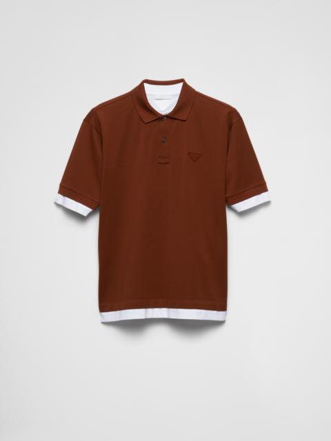 The cotton polo shirt is reinterpreted with layering that gives a classic silhouette contemporary and sporty appeal. Oversized lines define in short-sleeved style enriched with contrasting jersey trim and decorated with the emblematic fabric triangle logo. - Product code: UJN911_15DA_F0124_S_OOO - Short sleeve - Ribbed knit collar - Straight hem - Mother-of-pearl buttons - Conceptual triangle - Length 70 cm, Size M - Imported - The model is 190 cm tall and wears a size 48 Height: 70cm MATERIALS Main material: 100% cotton