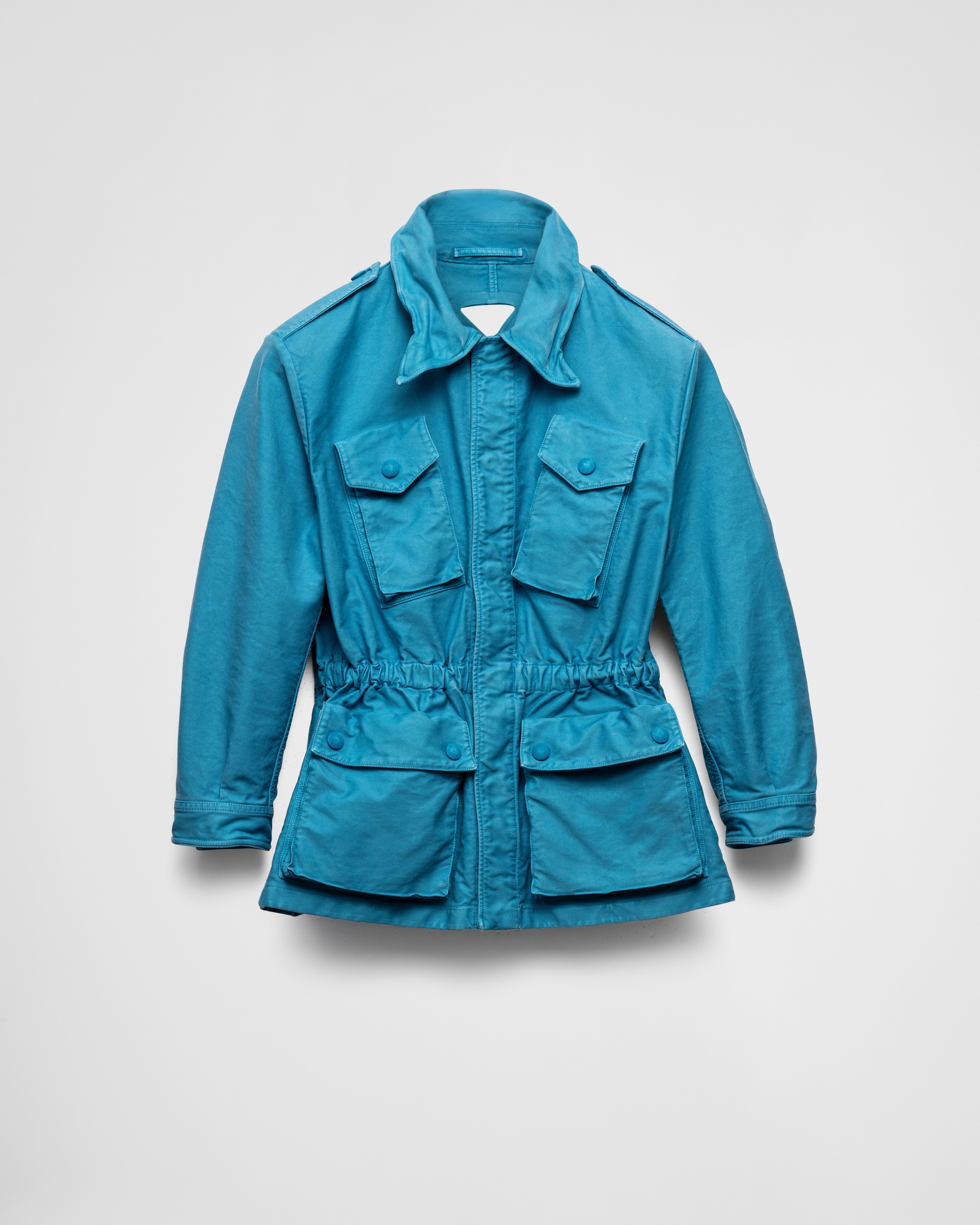 This cotton safari jacket embodies the many facets of the Prada aesthetic with a design that combines refined notes, utility details, and sophisticated functionality. - Produktcode: SGC779_16IF_F0136_S_OOO - Regular fit - Hooded collar - Straight sleeves - Button closure - Patch pockets with button - Buttoned cuff - Regular shoulder - Straight hem - Unlined - Cut-out triangle logo on the back - This garment has undergone an artisan process after assembly to give it a deliberate vintage look. - Eingefuhrt - The model is 188 cm tall and wears a size 48 Hohe: 70cm MATERIALS Hauptmaterial: 100% cotton