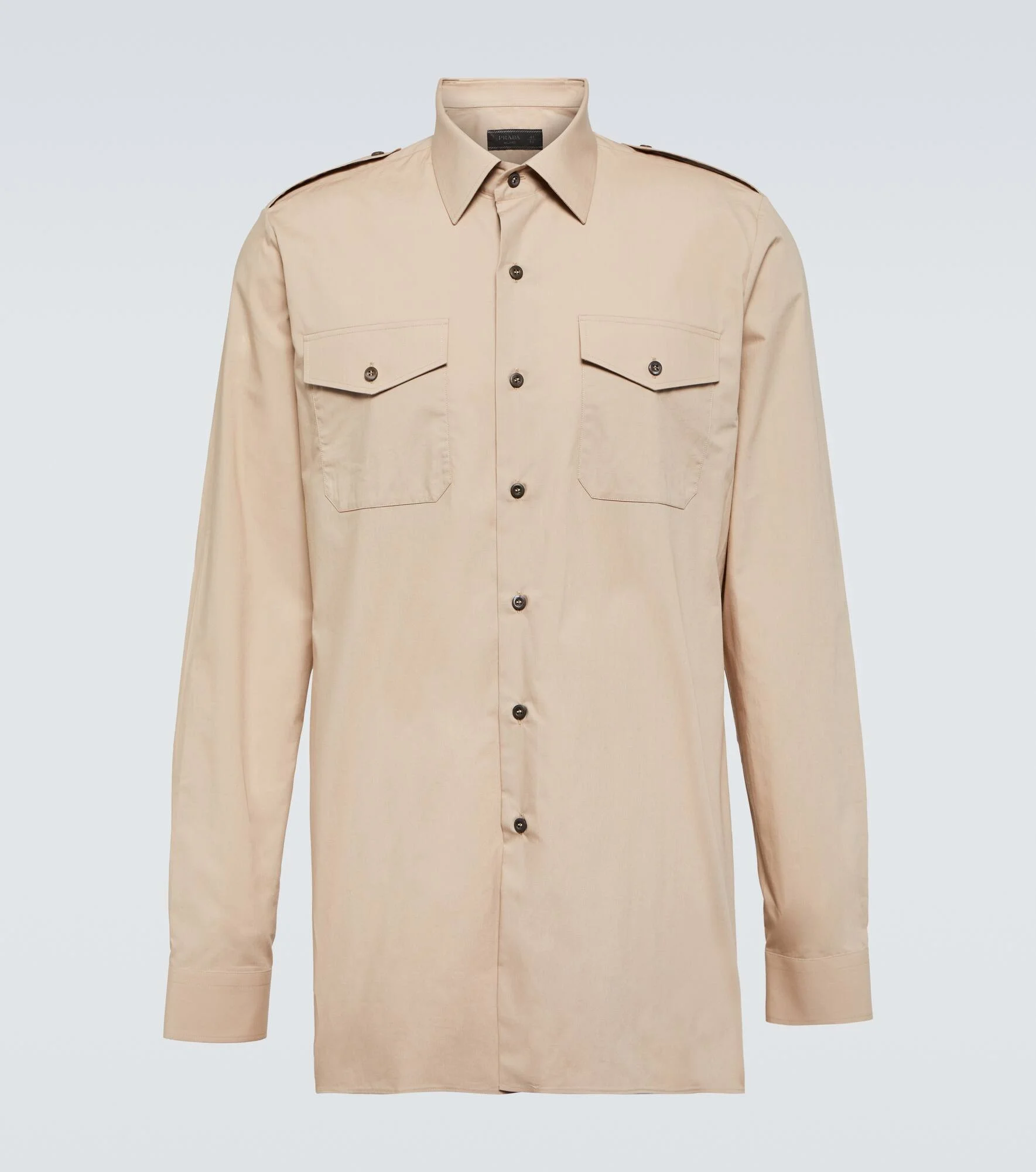 Prada takes Italian heritage into a distinctly modern direction with a streamlined and fashion-forward approach. Italian-crafted from pure cotton, this shirt is detailed with utilitarian-style patch pockets and shoulder epaulets. Product Details - Material: 100% cotton - Care instructions: hand wash - Made in Italy - Designer color name: Cammeo - Contains non-textile parts of animal origin - Closure: buttoned placket - Pockets: breast pockets - Buttoned cuffs - Item number: P00837248 Size & Fit - True to size - Without pleats in the back - Straight fit - Falls below the hip - The model in the picture is 185cm-6'1" and wearing a size EU 39