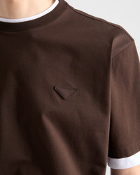 The classic cotton tee is reinterpreted with layering and contrasts that add a new touch to the sporty silhouette. The style defined by a relaxed fit is decorated with the emblematic fabric triangle logo. - Product code: UJN912_11CD_F0192_S_OOO - Boxy fit - Short sleeves - Straight hem - Conceptual triangle - Length 70 cm, Size M - Imported - The model is 187 cm tall and wears a size 48 Height: 70cm MATERIALS Main material: 100% cotton
