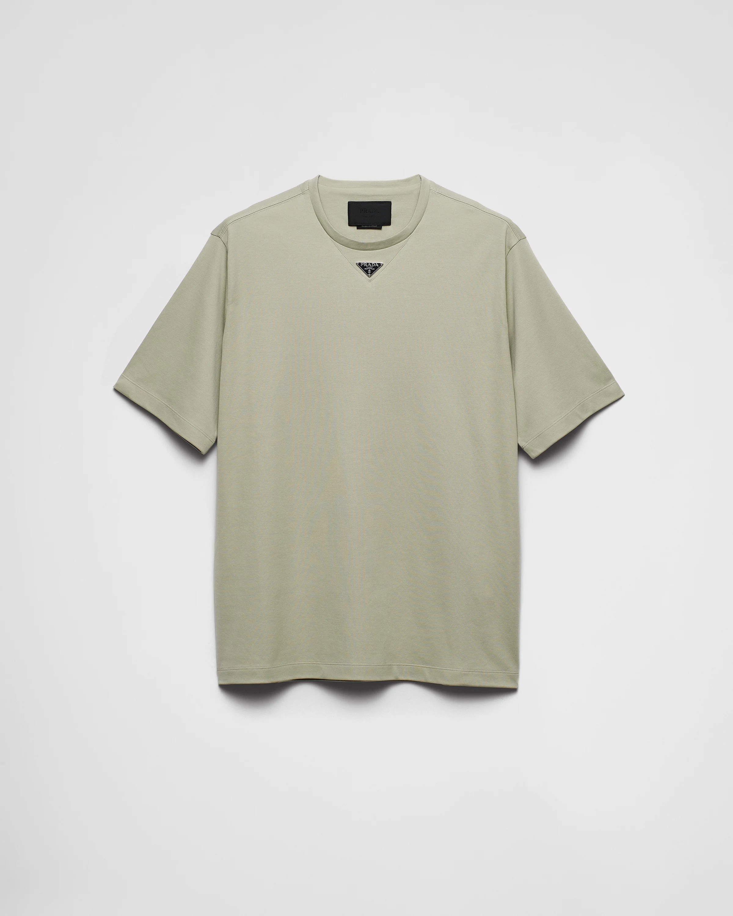 This short-sleeved cotton tee with ribbed knit crew neck has an oversized fit. The garment is decorated with the iconic enameled metal triangle logo on the front. - Product code: UJN861_240_F0E1D_S_232 - Oversized fit - Short sleeves - Straight hem - Enameled metal triangle logo - Imported - The model is 189 cm tall and wears a size 48 Height: 74cm MATERIALS Main material: 100% cotton