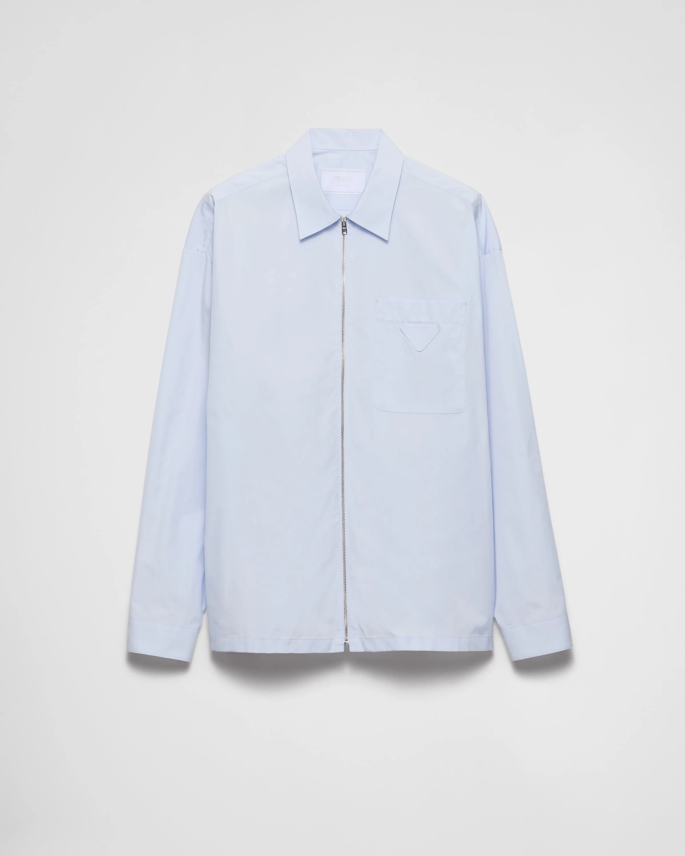 The duality that characterizes Prada collections is reflected in the creation of hybrid designs that blend different materials and styles to create something innovative. The shirt, a menswear wardrobe staple, with a classic collar and loose fit is reimagined with a zipper closure that gives it a contemporary touch. The iconic fabric triangle logo patch decorates the garment. - Product code: SC540_10IV_F0AHQ_S_211 - Loose fit - Classic collar - Classic breast pocket - Straight hem - Cuff with mother-of-pearl button - Zipper closure - Fabric triangle logo on the front - Imported - The model is 188 cm tall and wears a size 48 Height: 72cm MATERIALS Main material: 100% cotton