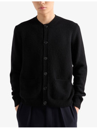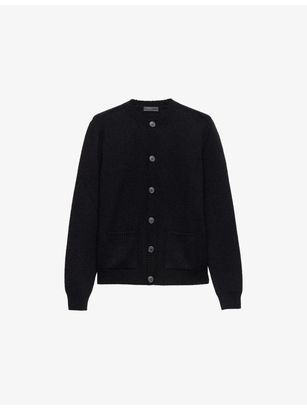 PRODUCT DETAILS - Prada cashmere cardigan - 100% cashmere - Button fastening - Slim-fit silhouette, ribbed knit neck trim, regular shoulder, ribbed knit cuffs and hem, triangle logo, patch pockets - Model is 6ft 2in/1.87m and wears a size UK 38 - Midweight, slight stretch - Please note, we are unable to accept in-store returns on Prada orders Ref: R04523732