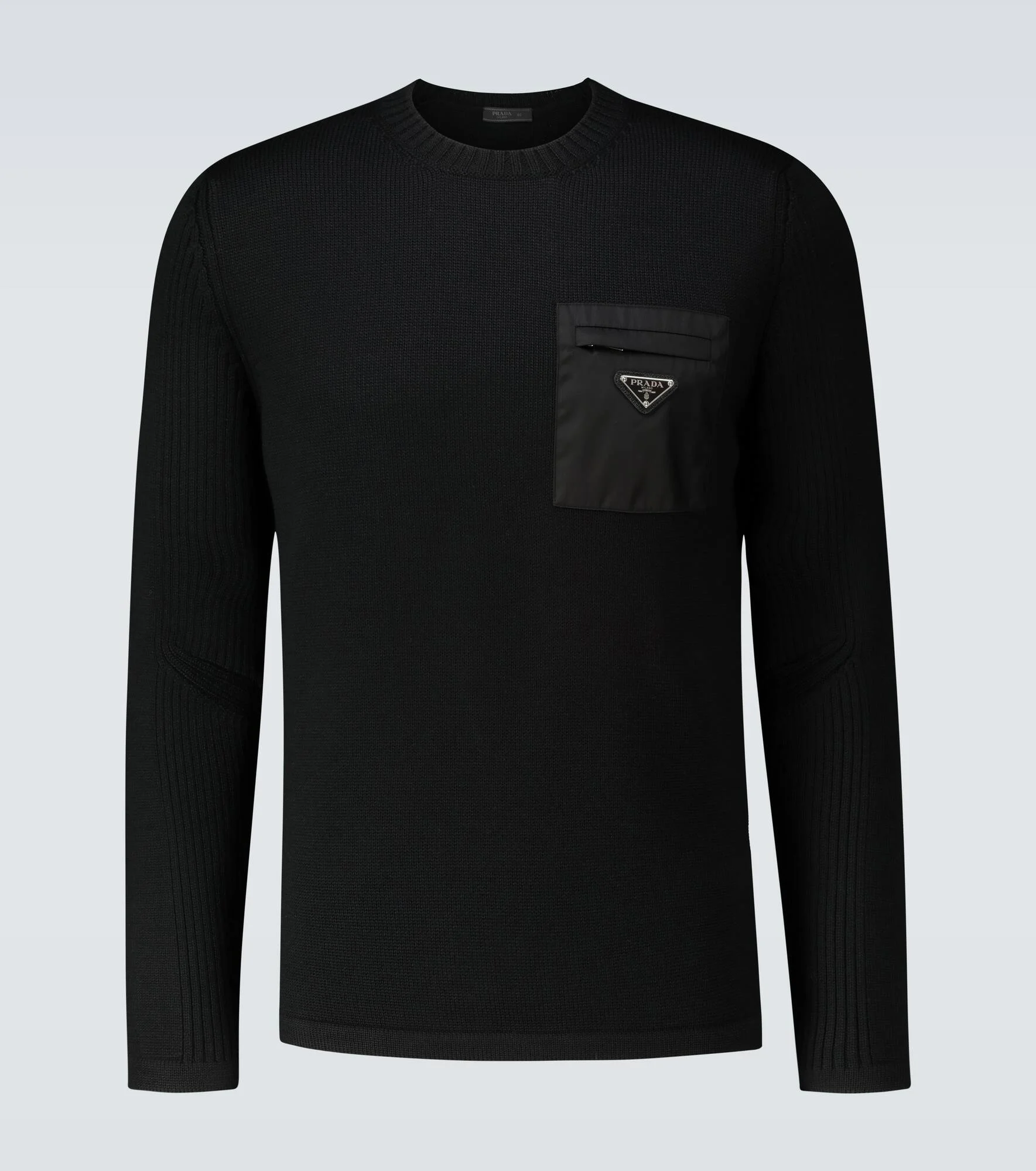 Italian-made from 100% wool, this classic crewneck sweater from Prada in black is detailed with a zipped nylon pocket at the chest, featuring the label's triangle logo. Product Details - Made in Italy - Material: 100% polyamide - Care instructions: specialist clean - Pockets: breast pocket - Item number: P00486964 Size & Fit - True to size - Designed for a loose fit - Falls to the hip - The model in the picture is 185cm-6'1" and wearing a size IT 48