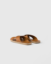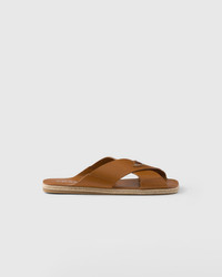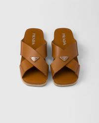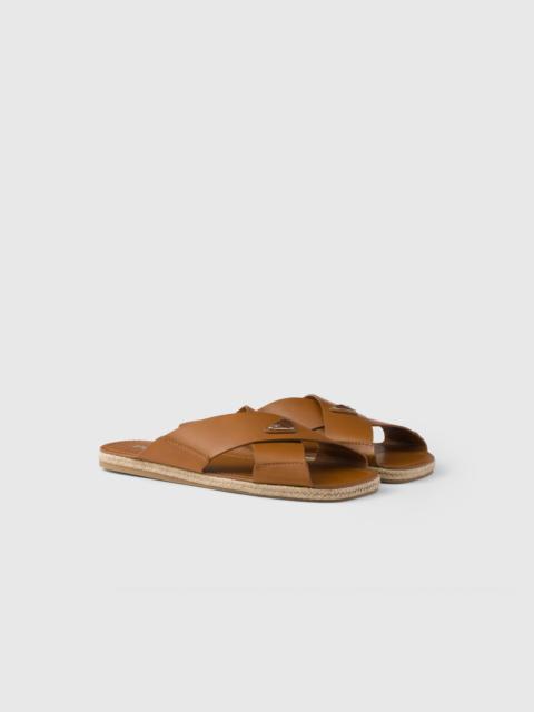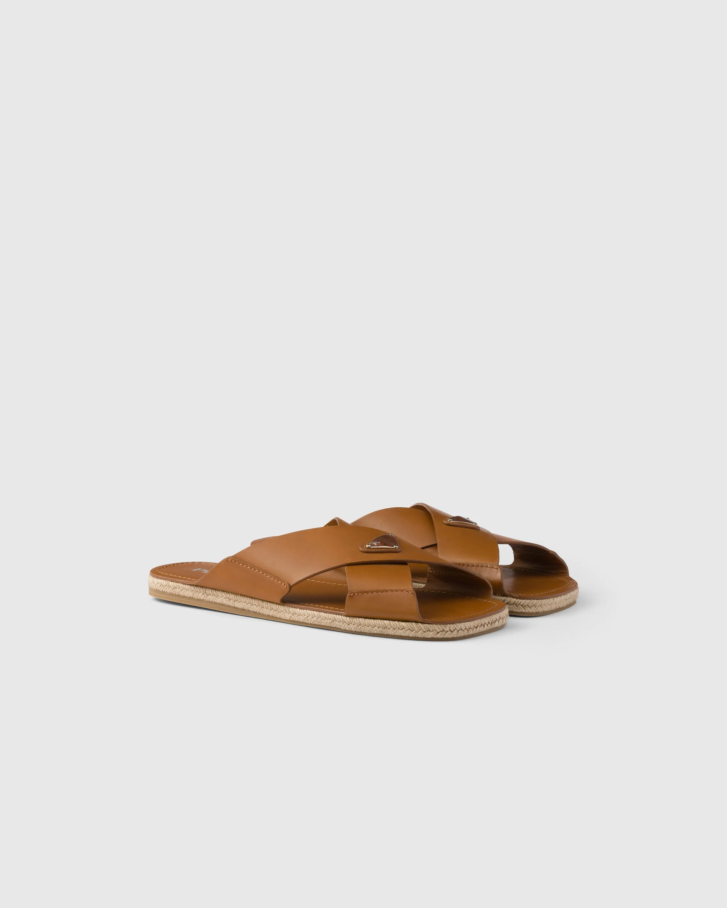 These leather slides with a sleek design embody a casual-chic style. The crisscross silhouette with raffia details is completed by the iconic shape of the triangle logo. - Product code: 2X3141_248_F0054_F_G000 - Enameled metal triangle logo - Raffia mid-sole with rubber sole - Heel height: 15 mm - Leather-covered insole - Imported MATERIALS Main material: Calfskin