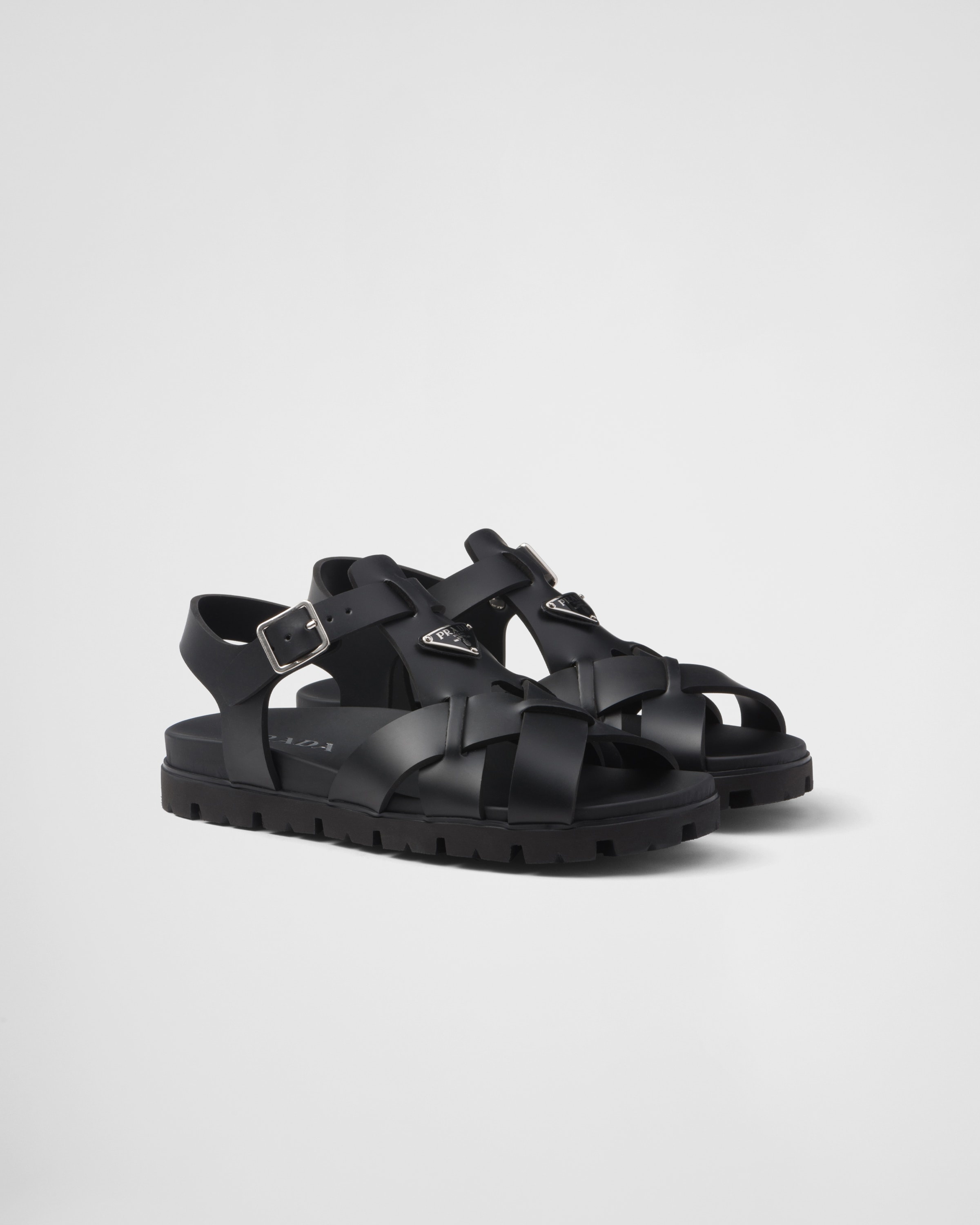 These rubber sandals have a hybrid silhouette that combines simple details with contemporary charm and retro influences. The crisscross style with ankle strap features a rubber sole with lug tread that adds a sporty touch. - Product code: 2X3118_3LKK_F0002 - Enameled metal triangle logo applied on the upper - Rubber sole with lug tread - Heel height: 025 mm - Leather-covered insole - Imported MATERIALS Main material: Ethyl vinyl acetate - eva