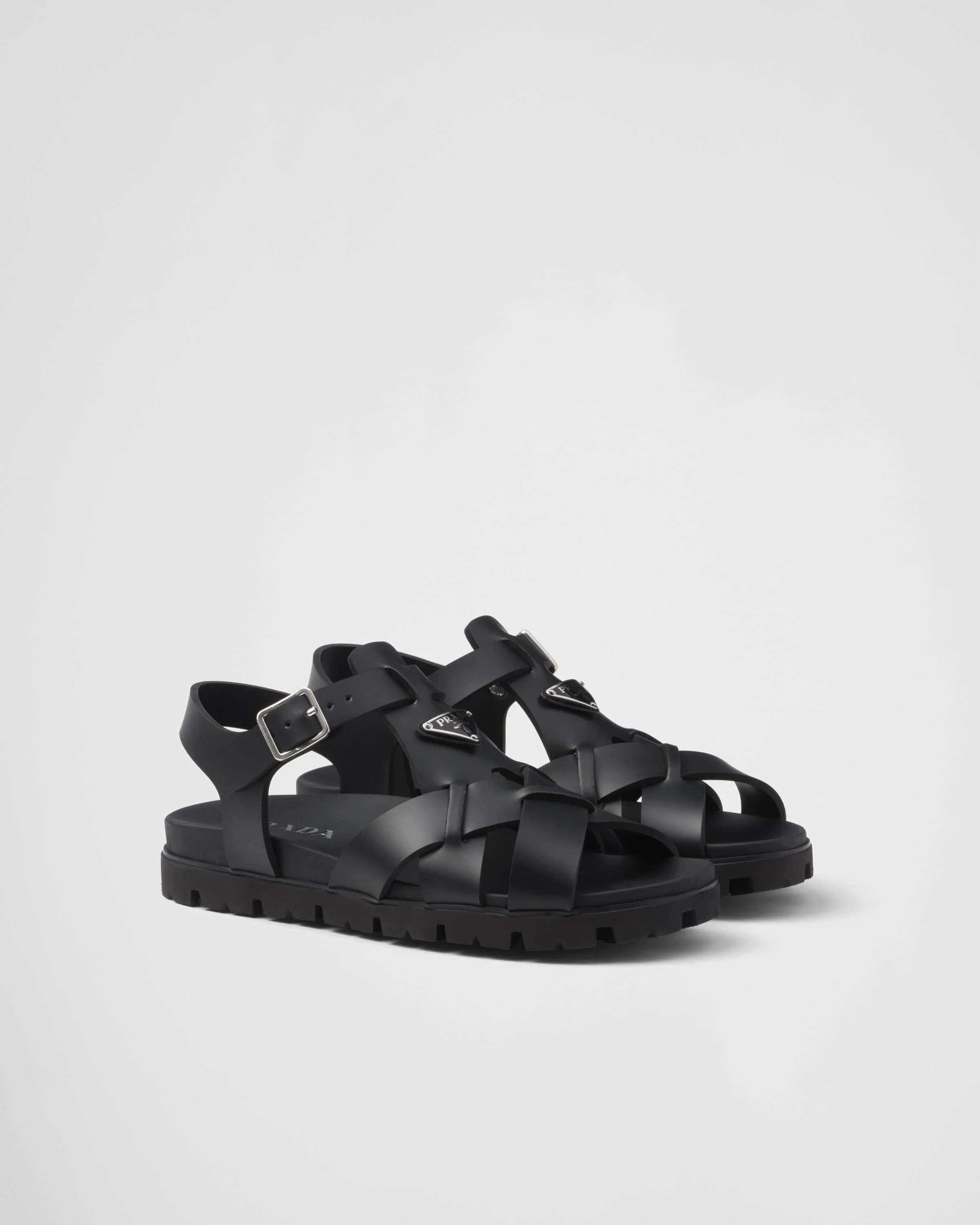 These rubber sandals have a hybrid silhouette that combines simple details with contemporary charm and retro influences. The crisscross style with ankle strap features a rubber sole with lug tread that adds a sporty touch. - Product code: 2X3118_3LKK_F0002_F_G000 - Enameled metal triangle logo applied on the upper - Rubber sole with lug tread - Heel height: 025 mm - Leather-covered insole - Imported MATERIALS Main material: Ethyl vinyl acetate - eva