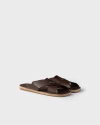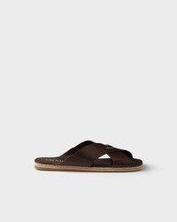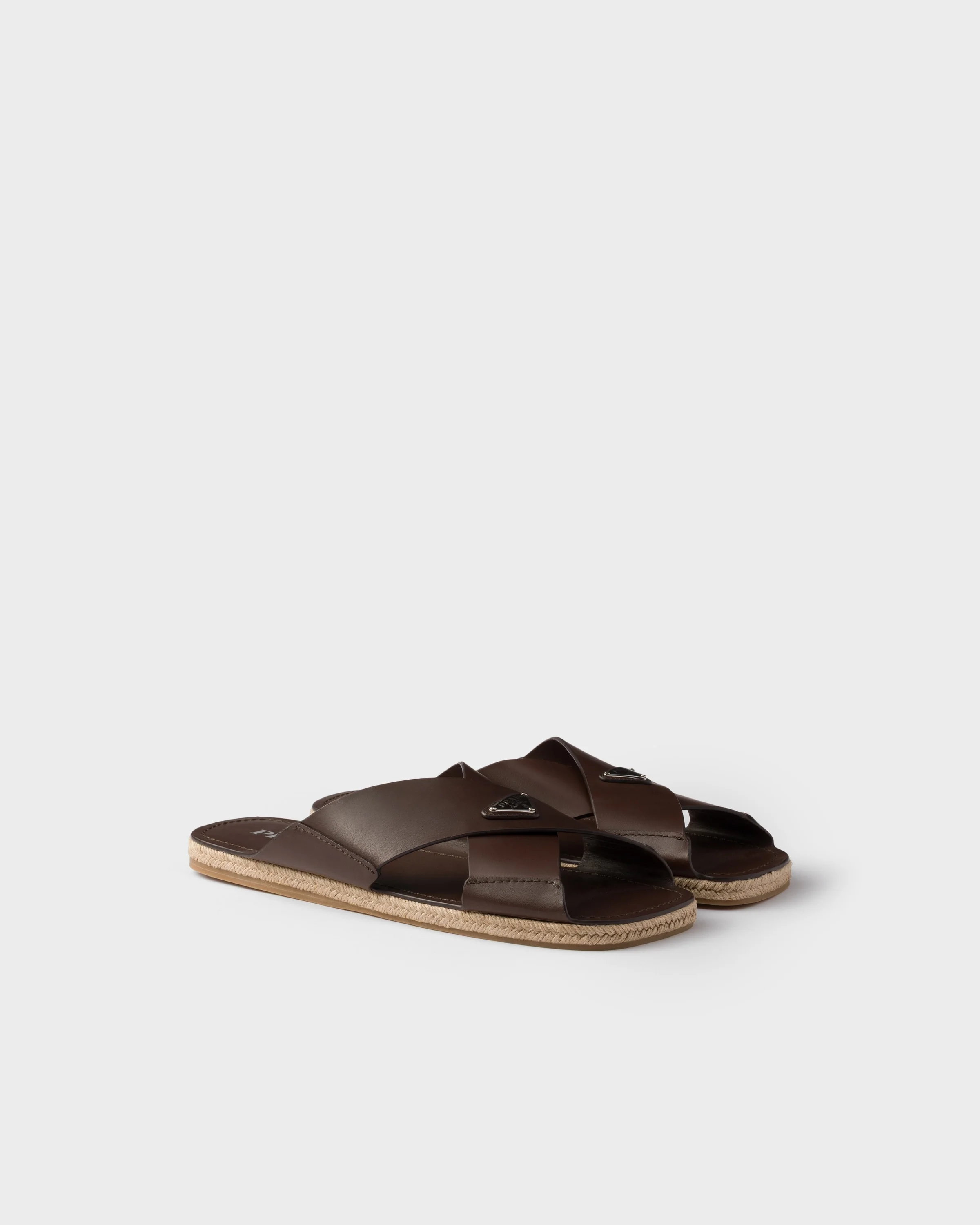 These leather slides with a sleek design embody a casual-chic style. The crisscross silhouette with raffia details is completed by the iconic shape of the triangle logo. - Product code: 2X3141_248_F0003_F_G000 - Enameled metal triangle logo - Raffia mid-sole with rubber sole - Heel height: 15 mm - Leather-covered insole - Imported MATERIALS Main material: Calfskin