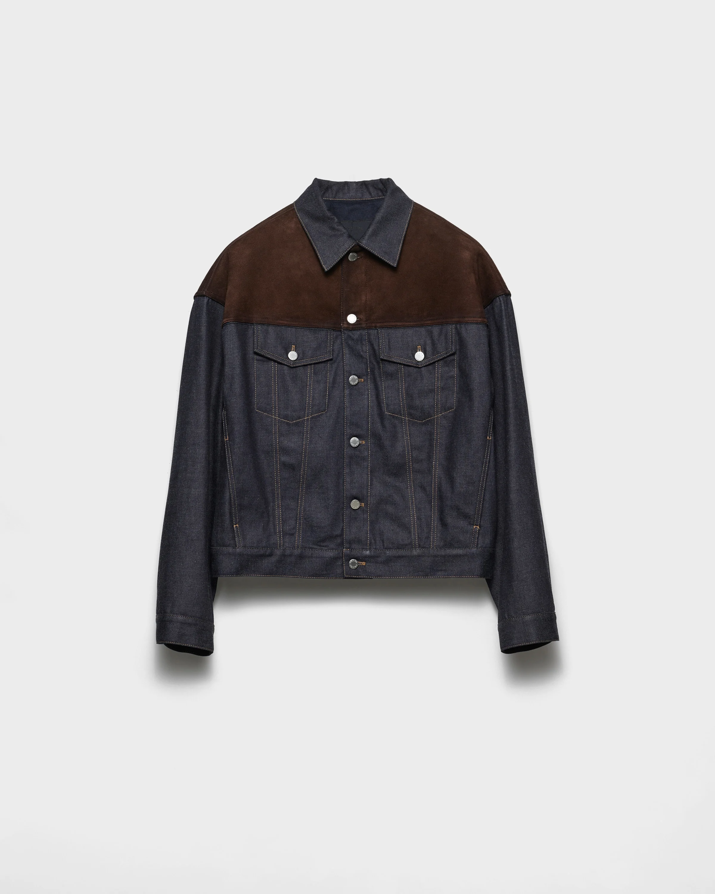 Enhanced in its construction and details, this denim blouson jacket acquires unique, refined allure. The timeless piece reinterpreted with a structured silhouette and cashmere lining is embellished with a soft suede yoke insert. - Product code: GEB291_17YZ_F0008_S_OOO - Raw denim treatment - Classic fit - Shirt-style collar - Long sleeves, cuffs with button - Front button closure - Contrasting stitching - Flapped patch pockets on the chest - Low welt pockets on the front - Center-back length: 64 cm. Size: M - Adjustable straight hem with buttons - Suede yoke - Fully lined in cashmere - Pressed garment - Prada Milano logo label on the back - Imported - The model is 188 cm tall and wears a size 48 Height: 64cm MATERIALS Main material: 100% cotton