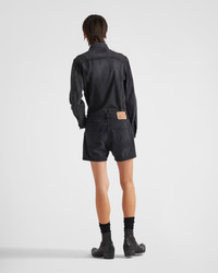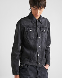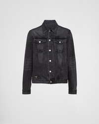 This denim blouson jacket with vintage allure recalls classic garments from the 1950s. This garment, part of the Spring Summer 2023 collection, has a used effect and is accented with a special label with red print on the back that recalls a logo from the archive. - Product code: GEB227_12K8_F0557_S_231 - Washed denim - Unlined garment - Classic fit - Shirt collar - Long sleeves - Cuffs with button - Front button closure - Tonal top-stitching - Buttoned flap patch pockets on the top - Length from center back: 64 cm, Size: M - Adjustable hem with buttons - Triangle logo - Prada Milano logo label on the back - Imported - The model is 188 cm tall and wears a size 48 Height: 64cm MATERIALS Main material: 100% cotton