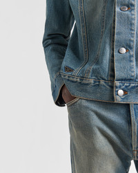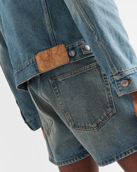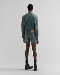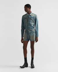 This denim blouson jacket with vintage allure recalls garments from the fifties. This garment, part of the Spring Summer 2023 collection, has a used effect and is accented with a special label with red print on the back that recalls a logo from the archive. - Product code: GEB227_12K1_F0V3N_S_231 - Used treatment - Unlined garment - Classic fit - Shirt-style collar - Long sleeves - Cuffs with button - Front button closure - Contrasting top-stitching - Buttoned flap patch pockets at the top front - Length from center back: 64 cm, Size: M - Adjustable hem with buttons - Triangle logo - Prada Milano logo label on the back - Imported - The model is 189 cm tall and wears a size 48 Height: 64cm MATERIALS Main material: 100% cotton