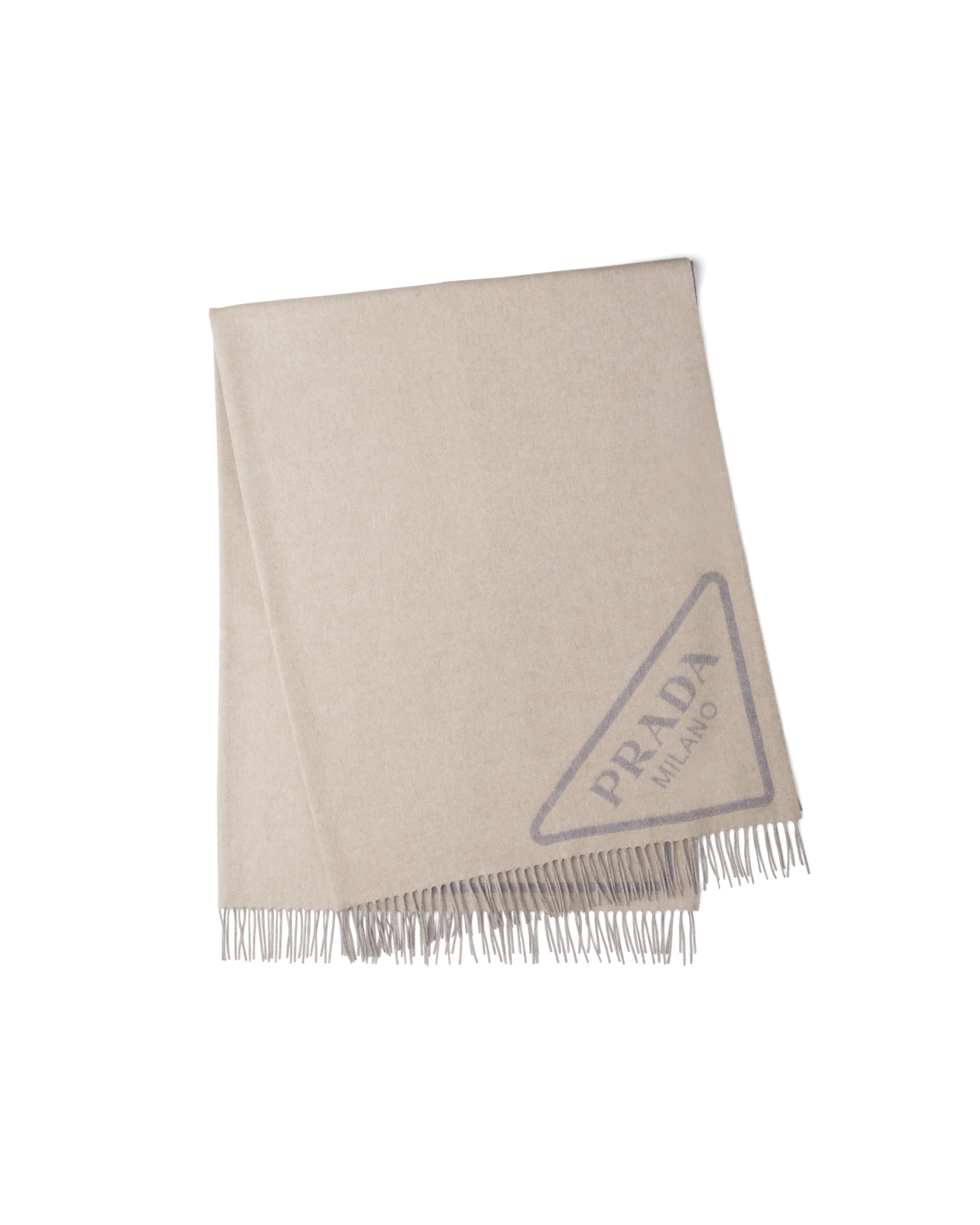 The triangle with lettering logo, an iconic symbol of the brand since 1913, is reinterpreted in a contemporary way and combined with a triangular geometric pattern of the jacquard motif decorating this soft double cashmere throw. Fringe trim on the edge completes the design. - Product code: 1QA002_2D3H_F0MFW - Jacquard triangle logo - Fringe trim on the edge - Imported Height: 180cm Width: 140cm MATERIALS Fabric