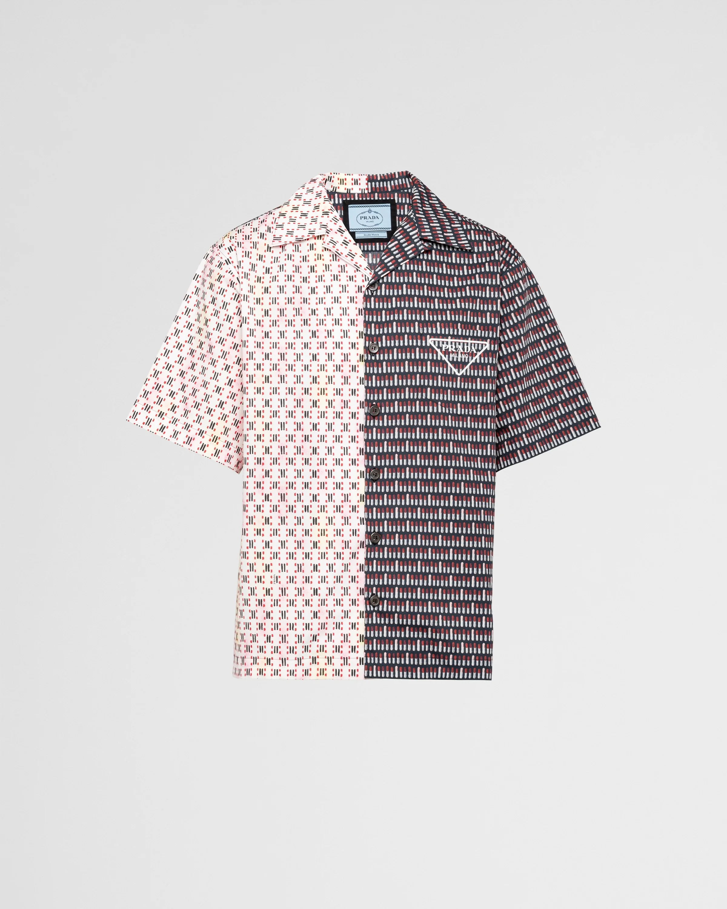 Strong graphic contrasts define Double Match shirts, animated by the dualities and contrasts emblematic of the brand. This cotton garment features a sporty oversized cut characterized by the distinctive bowling collar and enriched by the iconic Lipstick print contrasting with a geometric motif. The triangle logo printed on the breast pocket completes the silhouette with retro charm. - Product code: UCS406_14TM_F0002_S_212 - Stripe and Lipstick prints - Oversized fit - Bowling collar - Classic breast pocket - Straight hem - Mother-of-pearl button closure - Triangle logo printed on the front - Double Match shirt - Imported - The model is 189 cm tall and wears a size 48 Height: 72cm MATERIALS Main material: 100% cotton