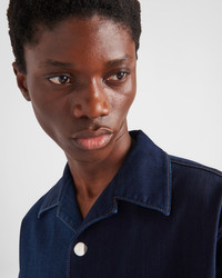A play of color contrasts animates this Double Match denim shirt that reflects the duality inherent in the Prada aesthetic. Emphasized by a washed treatment, the style with bowling collar has a sports-inspired boxy cut. The enameled metal triangle logo on the breast pocket completes the casual design with retro charm. - Product code: GEC096_14T1_F0SPF_S_OOO - Washed denim treatment - Boxy fit - Bowling collar - Short sleeves - Front snap closure - Contrasting stitching - Breast pocket - Straight hem - Center-back length: 72 cm, Size: M - Triangle logo - Imported Height: 72cm MATERIALS Main material: 72% cotton 1% elastane 19% polyester 8% viscose