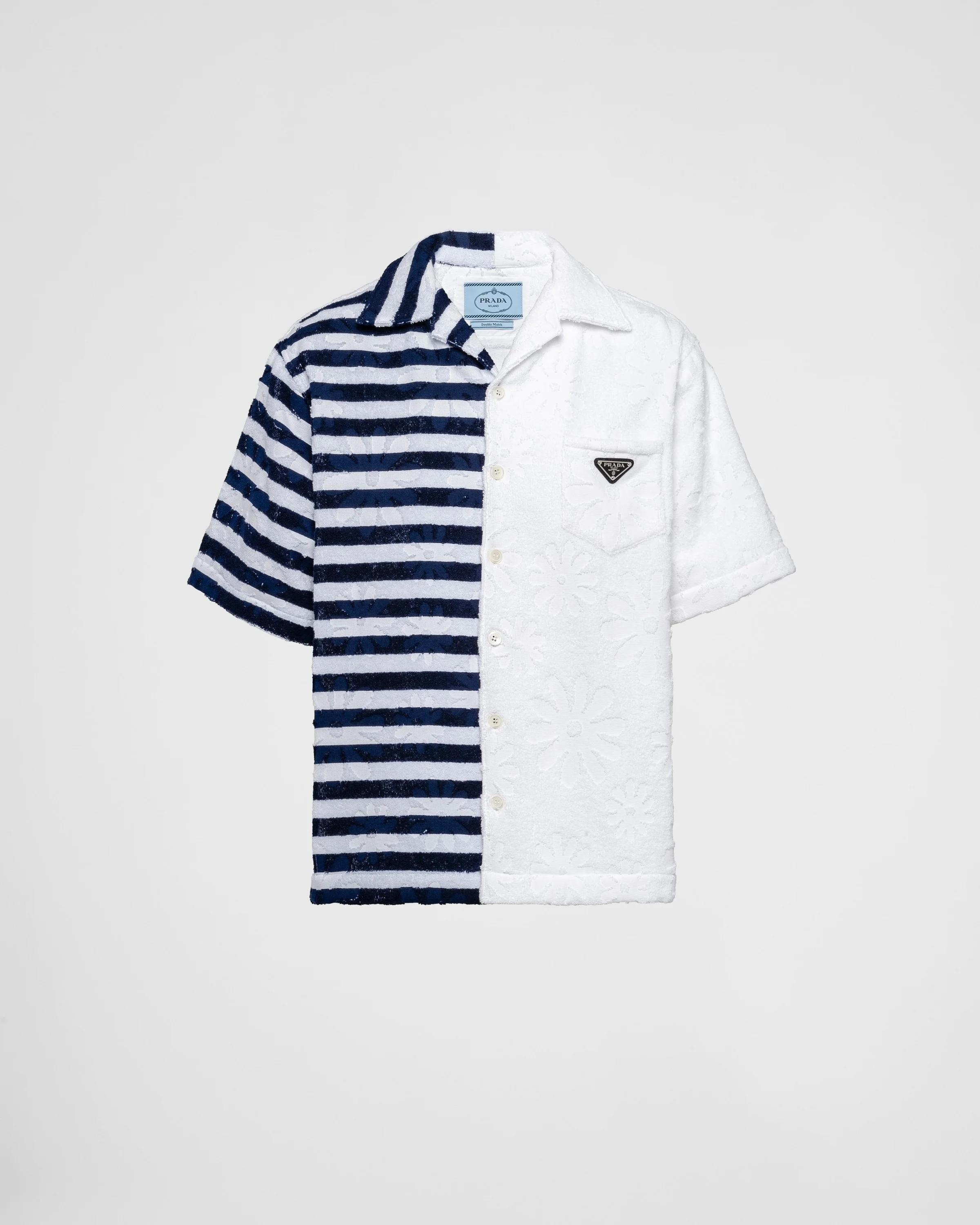 The shirt with bowling collar combines a sporty attitude and retro inspiration in a design with sophisticated allure. This style made of cotton with an oversized silhouette has two contrasting sides that recall the dualist aesthetic that is an emblem of the brand. The item embellished with mother-of-pearl buttons is decorated with the printed lettering logo in a contrasting color on the breast pocket. - Product code: UCS406_14TN_F0P41_S_212 - Stripe print - Oversized fit - Bowling collar - Classic breast pocket - Straight hem - Mother-of-pearl button closure - Enameled metal triangle logo on the front - Double Match shirt - Imported - The model is 189 cm tall and wears a size 48 Height: 72cm MATERIALS Main material: 100% cotton