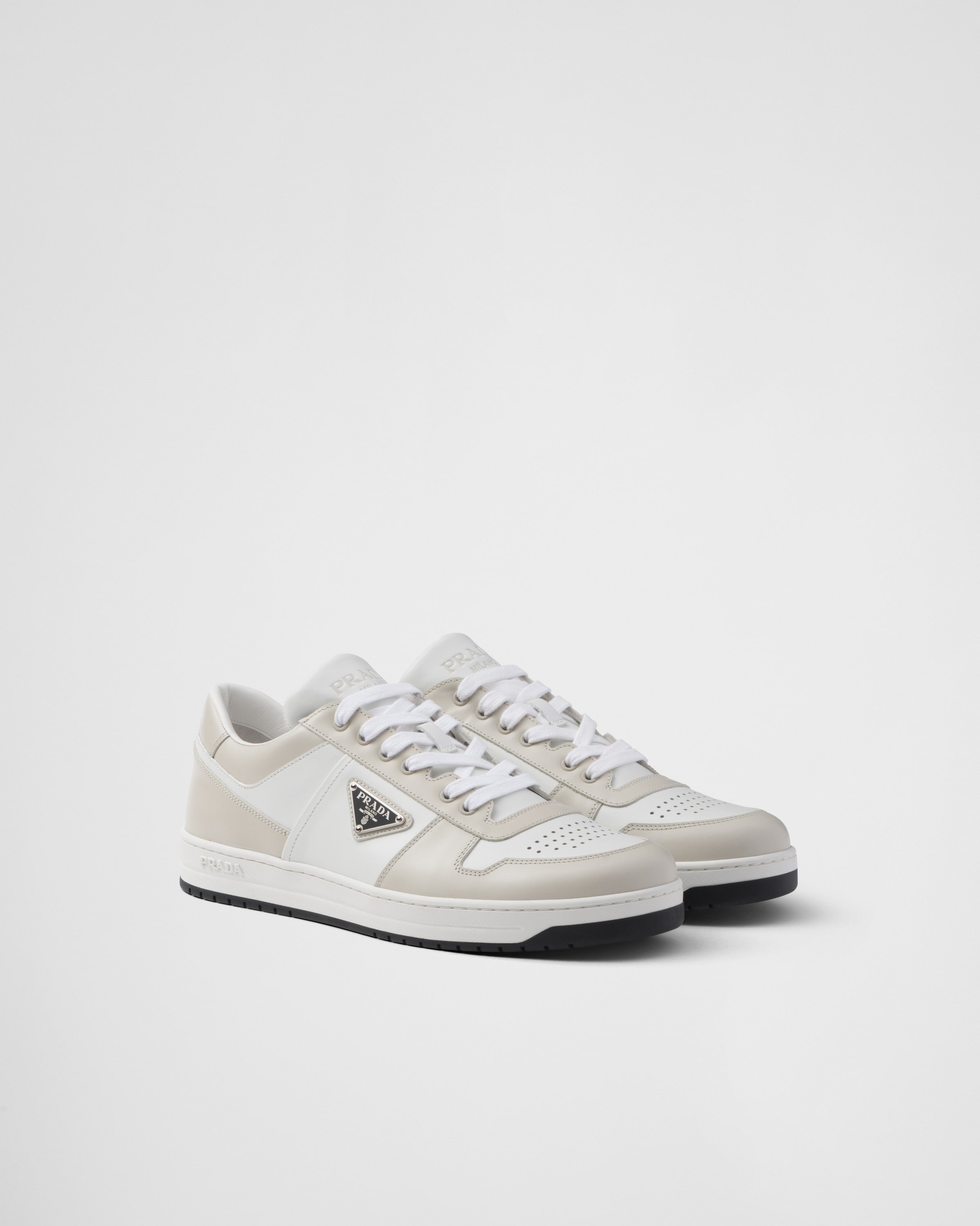 A sporty design with contemporary charm characterizes these leather sneakers with clean lines and a light rubber sole. The shoe, enhanced by different interpretations of the Prada logo, is completed by the distinctive touch of the iconic enameled metal triangle logo. For sustainable care to preserve the product's characteristics and reduce microfiber shedding, we recommend not washing the item too often. Let the product air out after every use and have it dry cleaned at a specialized ecological dry cleaners. - 商品货号: 2EE364_3LOI_F0R6E_F_D001 - With metal eyelets and cotton laces - Upper with enameled metal triangle logo - Prada Milano logo embossed on the tongue - Light box sole with embossed logo on the side - Sole height: 35 mm - Removable leather-covered insole - 产品标签信息 MATERIALS Leather