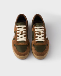 Downtown sneakers, inspired by basketball shoes, stand out for their sporty design with distinctive, refined details. The iconic style, embellished with different interpretations of the Prada logo, comes in suede with Re-Nylon details. - Product code: 2EE364_LOW_F0M36_F_D002 - With metal eyelets and cotton laces - Upper with enameled metal triangle logo - Prada Milano logo embossed on the tongue - Lightweight box sole with embossed logo on the side - Sole height: 35 mm - Removable leather-covered insole - Imported MATERIALS Main material: Calfskin