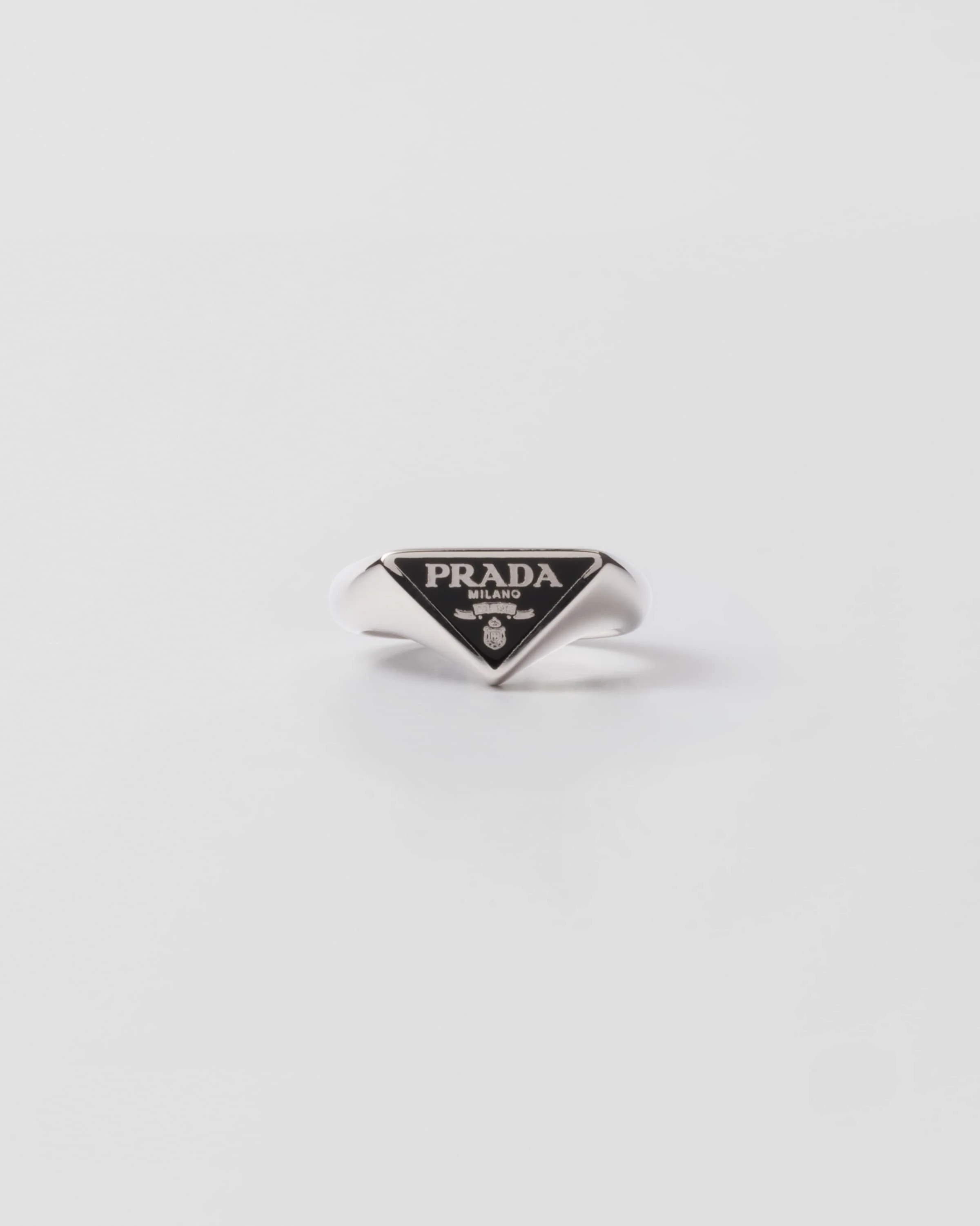 The geometric shape of Prada's triangle logo defines this 925 sterling silver ring with a modernist design. - Product code: 2JA201_2DSP_F0002 - Enameled 925 sterling silver - Visible logo on triangle - Available in different sizes - Imported MATERIALS 925 Silver
