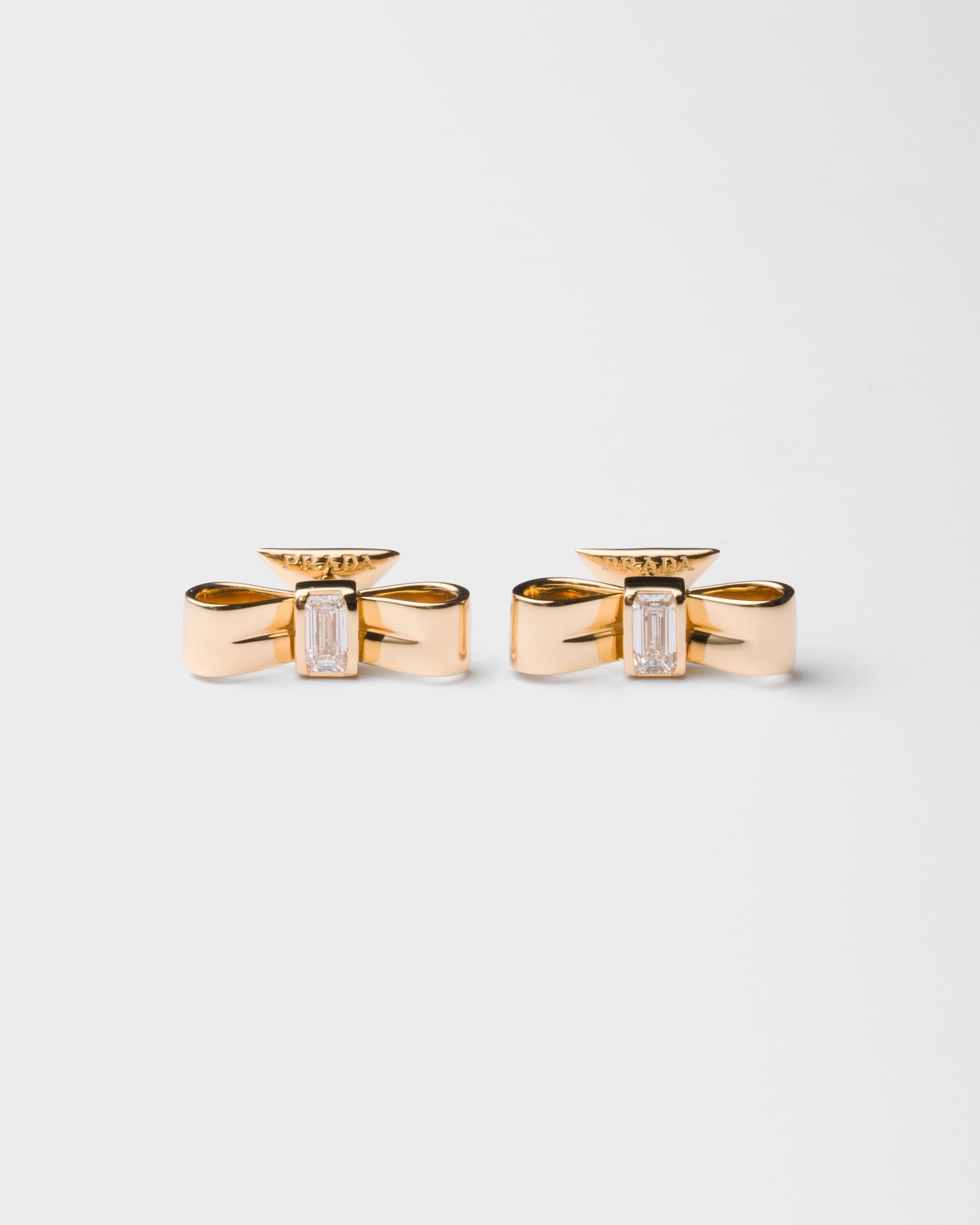 The rediscovery of jewelry archetypes continues with a modern interpretation of the bow, an eternal and delicate symbol transformed in form and meaning according to Prada's unique codes. Pure, simple lines create these recycled yellow gold earrings embellished with laboratory-grown diamonds. - Product code: 1JOA64_2ZCD_F00Y4 - Laser-engraved logo on the side - For pierced ears - Made in Italy - Each step of Prada's responsible gold and diamond production is verified and traceable thanks to Aura Blockchain technology. - Imported MATERIALS Gold 750