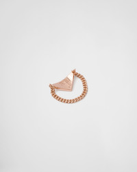 A sophisticated design distinguishes this rose gold ring from the fine jewelry collection. Precious diamonds illuminate the three corners of the triangle, creating an unexpected play of light. The chain gives the ring a modern and innovative tone, underlining the dual soul of Prada that is capable of combining past and present in a perfect mix of elegant details. - Product code: 1JA133_2FPD_F02Z2 - 750 Rose Gold (18 kt) with diamonds - Diamonds: 3 diamonds - Total carats: 0.222 ct - Cut: brilliant - Color: G+ - Clarity: VS+ - Triangle logo - Consult the Size Guide to find your size - Made in Italy - Each step of Prada's responsible gold and diamond production chain is verified and traceable thanks to Aura Blockchain technology. - Imported MATERIALS Gold 750