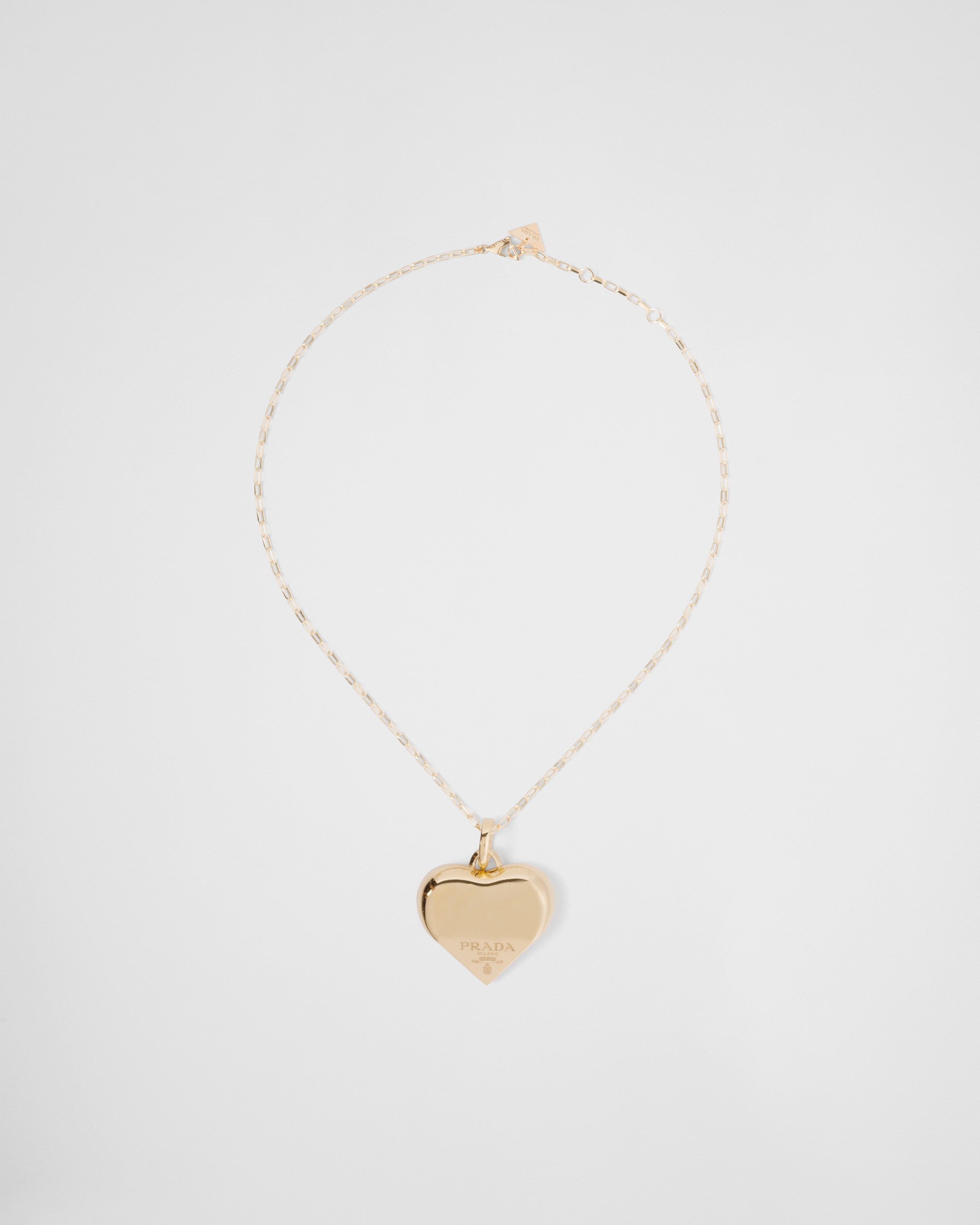 The heart, one of the universal symbols of love, becomes the protagonist of Prada's fine jewelry collection. The top of the pendant with bold pop-inspired lines elegantly contrasts with the clean, geometric elements of the Prada logo. The necklace made of recycled yellow gold is a precious and expressive jewel that embodies the brand's timeless tradition and ability to combine different concepts in a continuous dialogue aimed at affirming uniqueness and artisan know-how. - Product code: 1JCA31_2DA5_F0056 - 750 Yellow Gold (18 kt) - Heart pendant, height 3.5 cm (1.37 inches) - Lobster claw clasp - Length 45 cm (17.71 inches) adjustable to 43 cm (16.92 inches) and 41 cm (16.14 inches) - Made in Italy - Each step of Prada's responsible gold and diamond production chain is verified and traceable thanks to Aura Blockchain technology. - Imported MATERIALS Gold 750