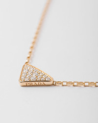 The triangle, Prada's identifying element, becomes the protagonist of this fine jewelry collection. Created as Mario Prada's logo for his travel trunks in 1913, it has been reinvented in a micro size on this pendant with a simple geometric shape embellished with pave diamonds. The sophisticated necklace in recycled yellow gold embodies the brand's timeless tradition and its ability to combine different concepts in an ongoing dialog affirming its uniqueness and artisan know-how. - Product code: 1JCA38_2FOW_F00Y4 - 750 Yellow Gold (18 kt) with diamonds - Diamonds: 21 diamonds – Total carats: 0.30 ct- Cut: Round – Color: G - Clarity: VS+ - Logo on medallion - Triangle pendant: 1.3 cm (0.51 inches) - Lobster claw clasp - Adjustable size - Length 45 cm (17.71 inches) adjustable to 43 cm (16.92 inches) and 41 cm (16.14 inches) - Made in Italy - Each step of Prada's responsible gold and diamond production chain is verified and traceable thanks to Aura Blockchain technology. - Imported MATERIALS Gold 750