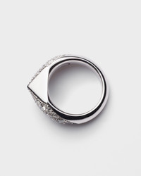 The Eternal Gold Collection establishes a dialogue between archetypal forms and eternal symbols. The iconic geometric shape of the Prada triangle becomes the focal element of this ring in white gold, framed by a diamond pave. Bold, three-dimensional lines create a contemporary and distinctive jewel, an expression of the interplay between innovation and artisanal excellence. - Product code: 1JA178_2CNO_F020I - 750 White Gold (18kt) with diamonds - Laser-cut logo on the inside - See the Size Guide to find your size - Made in Italy - Each step of Prada's responsible gold and diamond production is verified and traceable thanks to Aura Blockchain technology. - Imported MATERIALS Gold 750