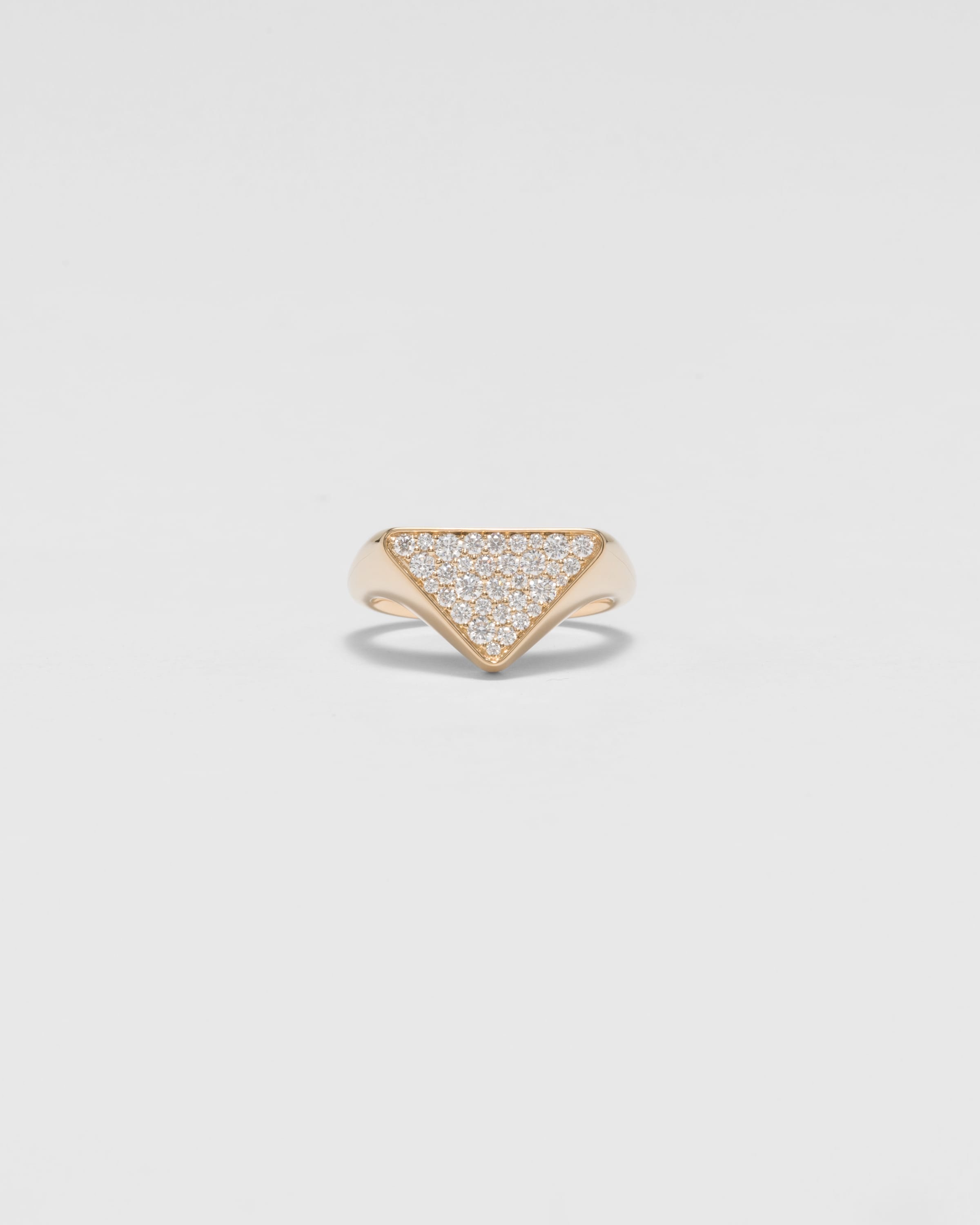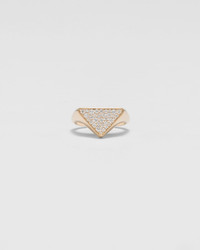 A pave of diamonds covers the surface of the iconic triangle, an expression of elegance, modernity, innovation, and an attention to artisan know-how that is typical of Prada. The fine jewelry collection features the logo that has existed since the brand was born, proposing it again in this style with a sleek line and sophisticated character. - Product code: 1JA130_2FOW_F00Y4 - 750 Yellow Gold (18 kt) with diamonds - Diamonds: 33 diamonds - Total carats: 0.473 ct - Cut: brilliant - Color: G+ - Clarity: VS+ - Laser-cut logo on the back - Consult the Size Guide to find your size - Made in Italy - Each step of Prada's responsible gold and diamond production chain is verified and traceable thanks to Aura Blockchain technology. - Imported MATERIALS Gold 750