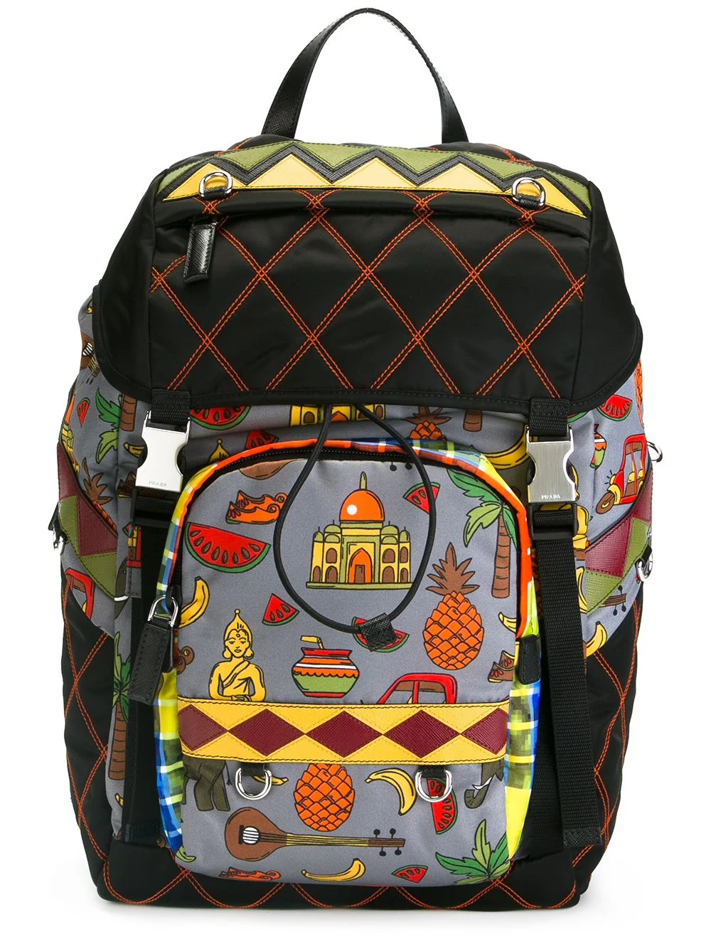 graphic print quilted backpack Multicolour graphic print quilted backpack from Prada. Composition Outer: Polyamide 100%, Calf Leather 100% SIZE & FIT Model measurements Height 6 ft 2 in(1.88 m) Bust/Chest 37.79 in(96 cm) Hips 37 in(94 cm) Waist 30.7 in(78 cm) Measurement WIDTH 11.81 in(30 cm) HEIGHT 15.74 in(40 cm) HANDLE 3.14 in(8 cm) DEPTH 5.9 in(15 cm) STRAP 19.29 in(49 cm)