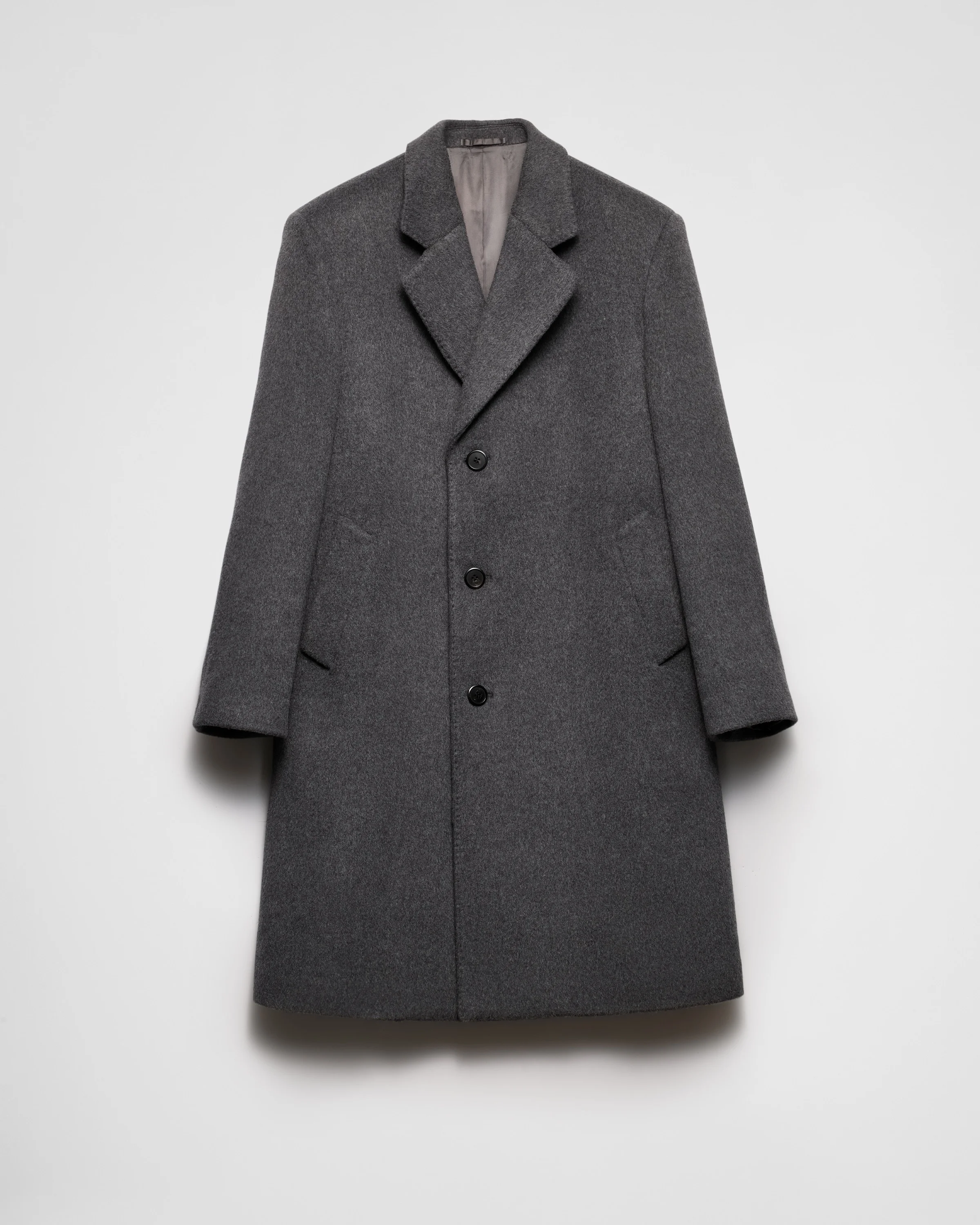 The classically elegant silhouette of this coat is reinterpreted with contemporary proportions, clean lines and refined details. The wool coat with a boxy cut is defined by classic notch lapels and back vent, while the knit triangle logo completes the garment with its iconic geometric shape. - Product code: UC512M_15J4_F0480_S_OOO - Boxy fit - Notch lapel - Center back vent - Three button closure - Cuffs without buttons - Wide welt pockets - Lined - Knit triangle on the back - Matching stitching - Imported - The model is 189 cm tall and wears a size 48 Height: 97cm MATERIALS Main material: 100% virgin wool
