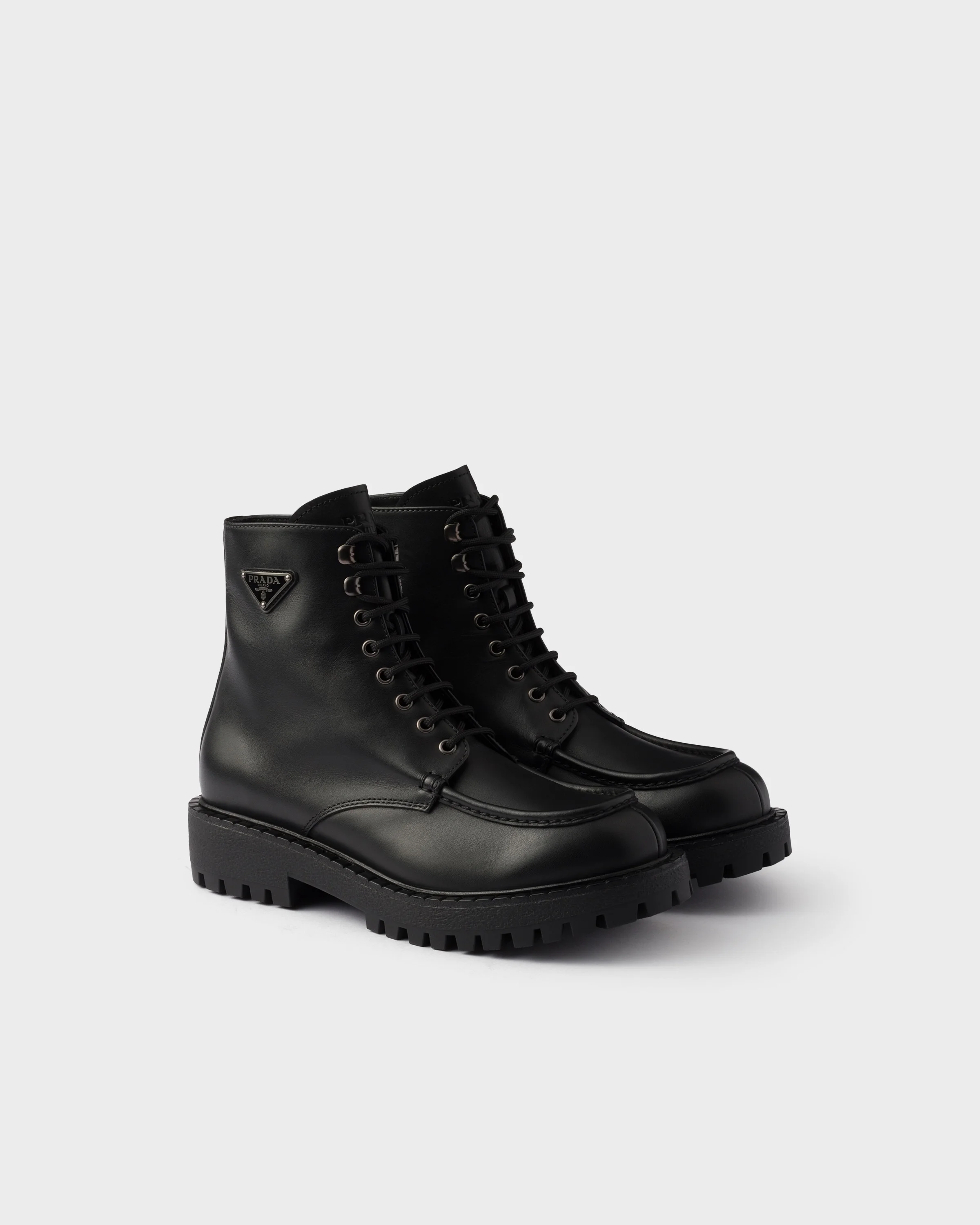 These booties, a reinterpretation of classic hiking boots, have a sporty design with refined details. The leather lace-up shoes with durable rubber soles are decorated with the enameled metal triangle logo. - Product code: 2TE214_070_F0002_F_G001 - With laces - Enameled metal triangle logo on the upper - Prada Milano logo on the tongue - Rubber sole with leather welt - Lug tread - Heel height: 44 mm - Removable leather-covered insole - Imported MATERIALS Main material: Calfskin