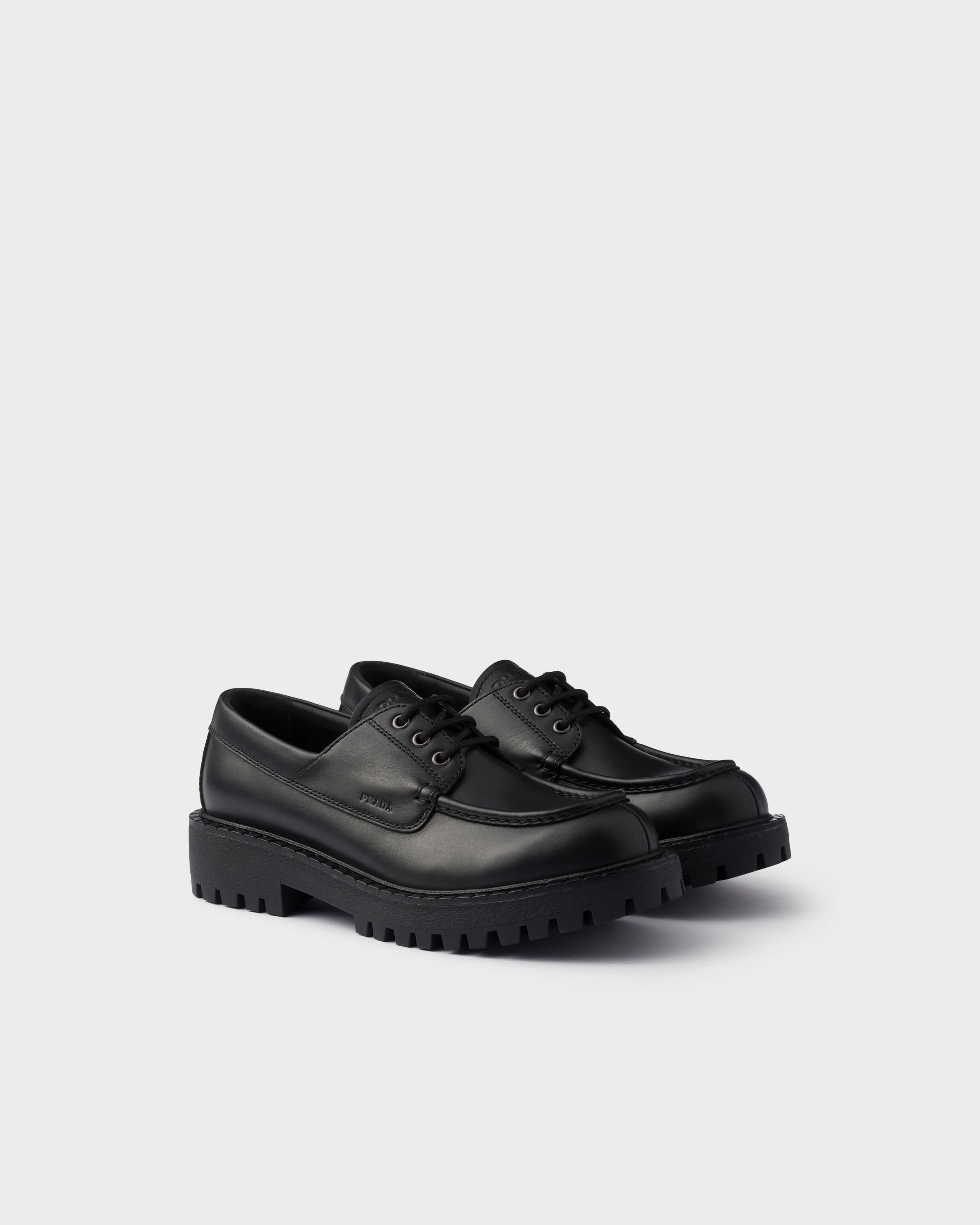 These lace-up loafers feature a hybrid design that combines classic lines and contemporary functionality. The leather design defined by sporty rubber soles is decorated with the enameled metal triangle logo. - Product code: 2EE416_070_F0002_F_G001 - With laces - Prada Milano logo embossed on the tongue - Rubber lug sole with leather welt - Sole height 60 mm - Removable leather-covered insole - Imported MATERIALS Main material: Calfskin