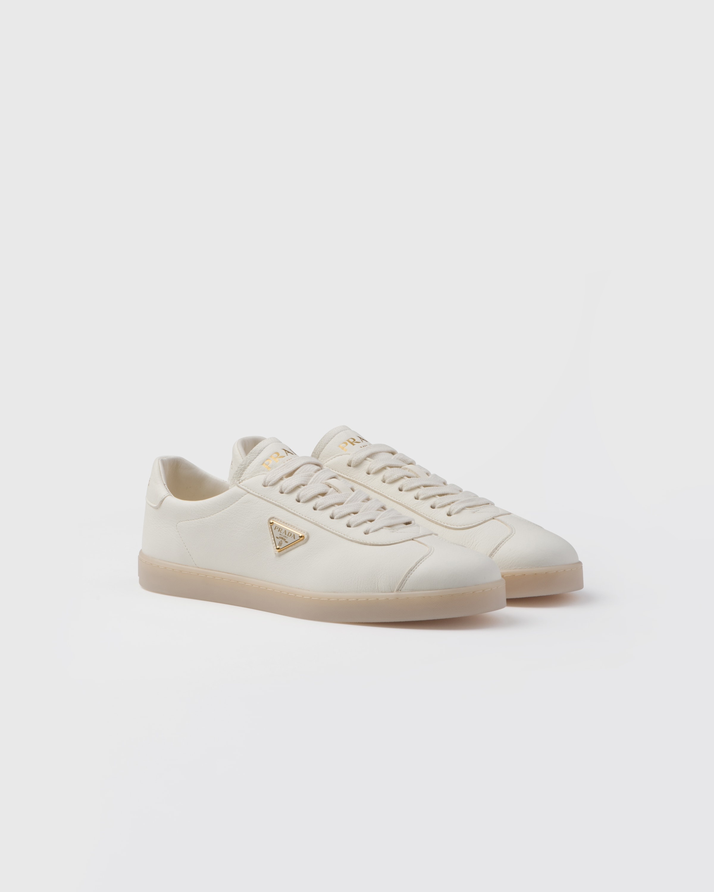 These versatile sneakers with a clean, modern design combines sporty style with sleek details. The leather shoe with rubber sole is decorated with the lettering logo embossed on the tongue, while the iconic enameled metal triangle logo completes the style with a refined touch. - Product code: 2EE394_013_F0304 - Upper with enameled triangle - Screen-printed logo embossed on the tongue and heel - Rubber box sole - Sole height: 25 mm - Removable leather-covered insole - Imported MATERIALS Leather