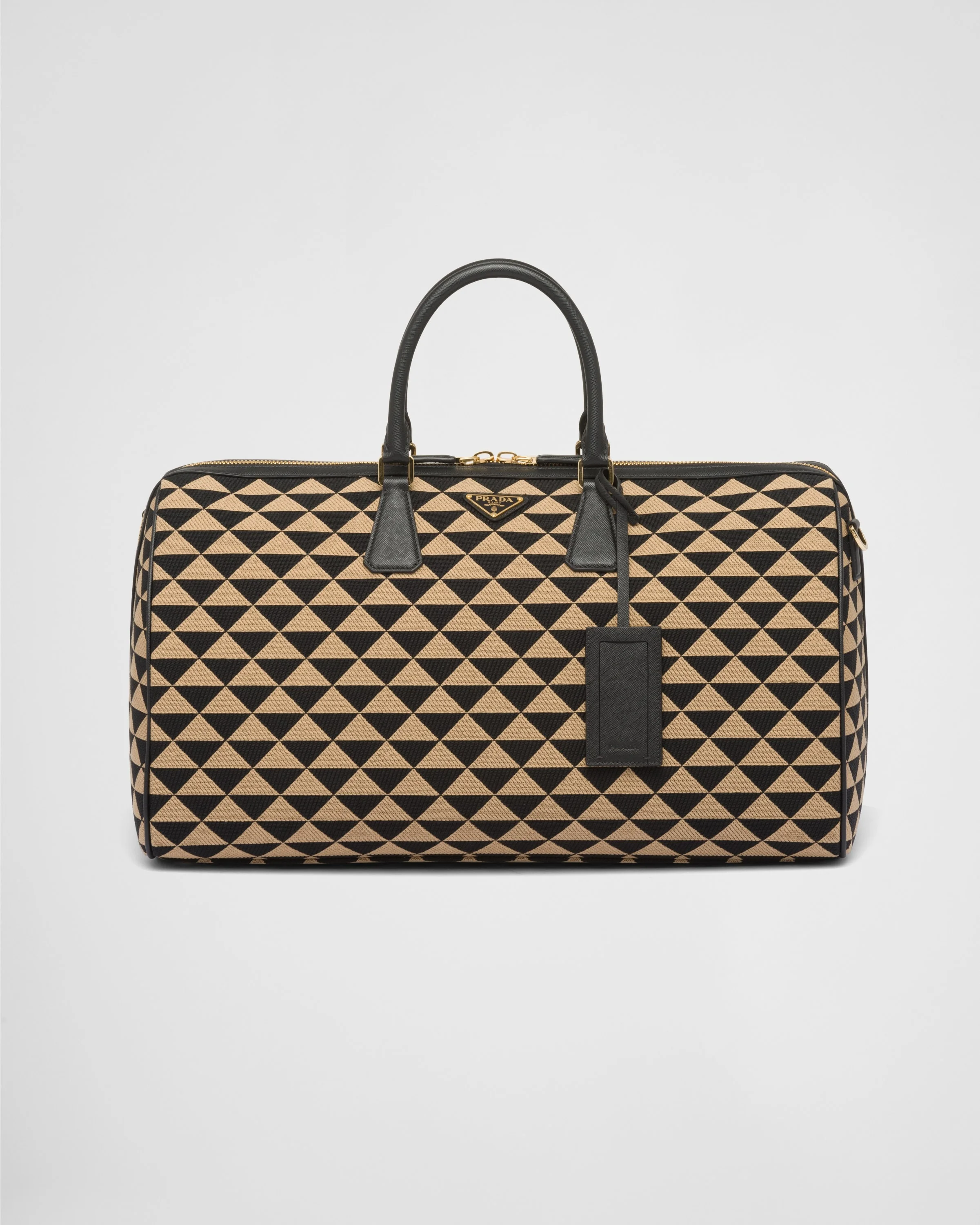 Introduced for the first time on trunks designed by Mario Prada, the Prada triangle expresses uniqueness and modernity through its universal, minimalist shape that is reinvented in a different way each season. Here, the geometric design is transformed into a sophisticated yet modernist pattern that plays with contrasting colors and decorates this travel bag in embroidered fabric. Details in the brand's iconic Saffiano leather embellish the design. - Product code: 2VC018_2FKL_F0Y30_V_OOO - Leather handles - Detachable adjustable woven nylon tape shoulder strap - Enameled metal triangle logo on the front - Zipper closure - Removable leather name tag and keychain - Interior with two zipper pockets - Re-Nylon logo lining - Metal feet - Imported Height: 27.5cm Width: 50cm Length: 25cm MATERIALS Main material: Polyester